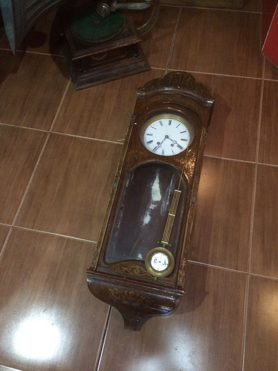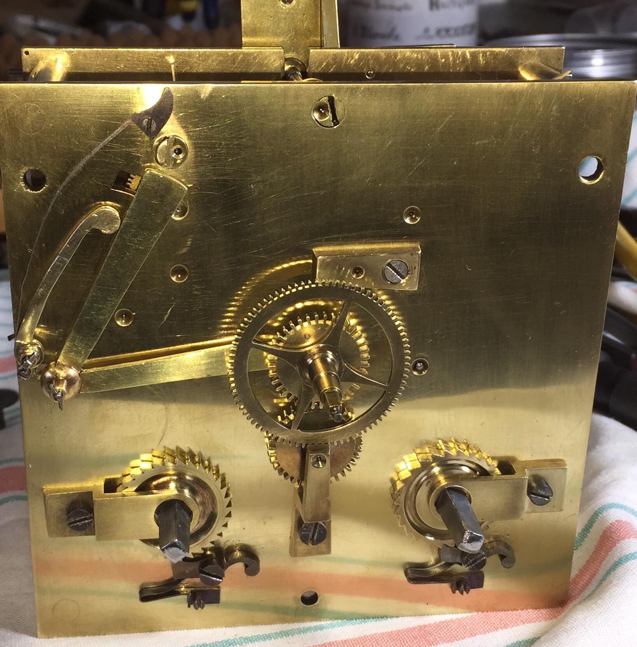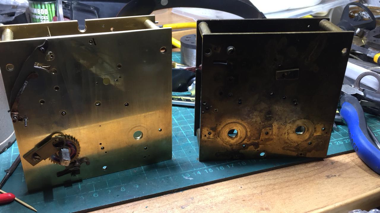 И этих картушей некомплект, мягко говоря. С латунными элементами картушей проблема была решена, а вот с эмальками, не всё гладко. Да и графику циферблата нужно восстанавливать,там всё закрашено-перекрашено, на несколько рядов... Механизм боя пограблен, недостаёт ,одного колеса, ветряка и молотка боя, основная проблема с изготовлением этого колеса. Механизм, очень уж нестандартный, какой-то ранний немец полукустарного изготовления, по мнению, гуру, и думаю, что оно верно. |