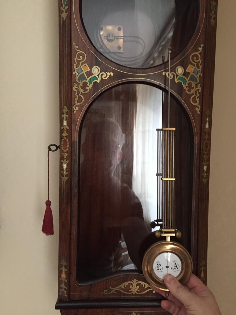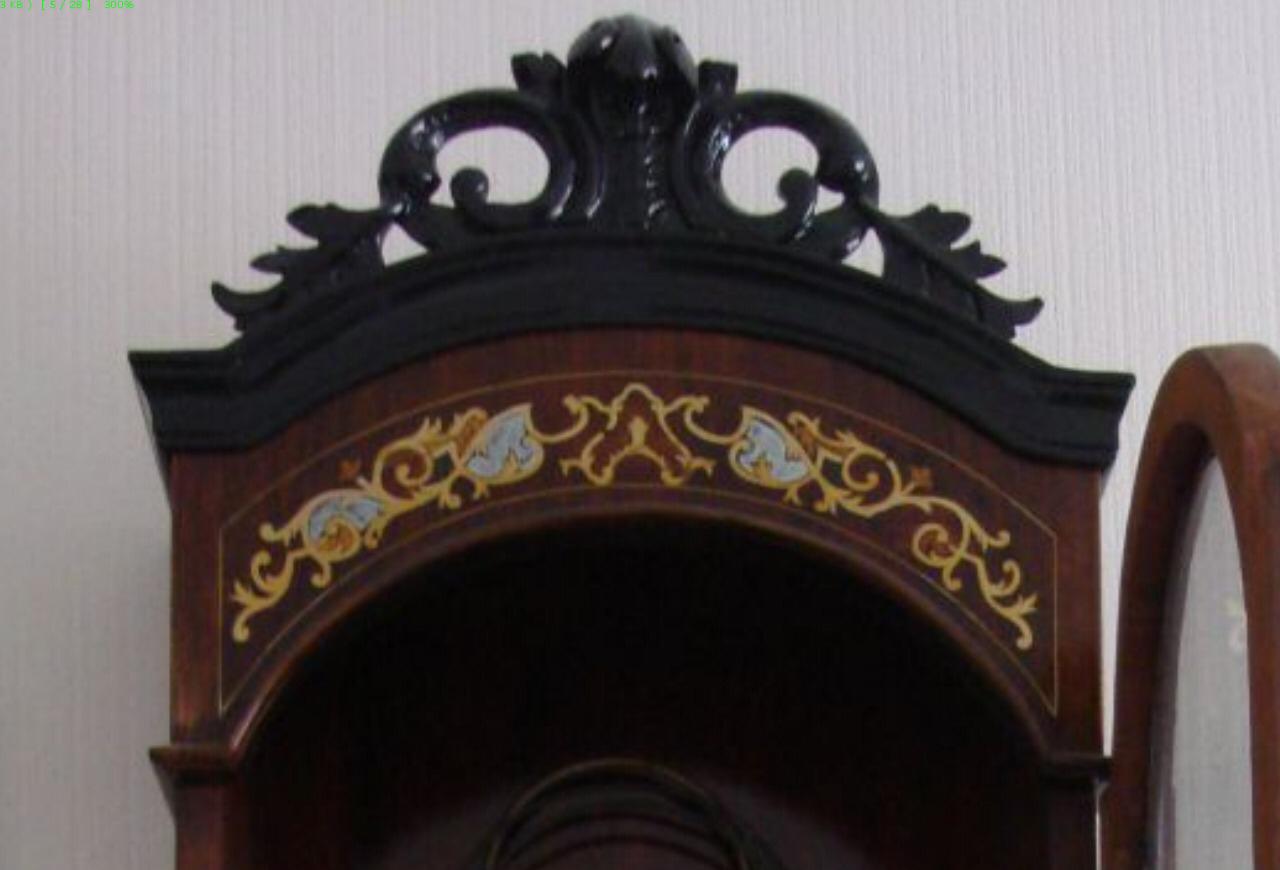 Есть пара вопросов. На задней стенке ни каких штампов производителя ? Верхняя резнушка сохранилась или восстанавливалась? На моём экз. в близкородственном корпусе, маятник ещё более куцый. Интересное наблюдение у подобного типа корусов, вероятно произведённых в какой-то одной мастерской, очень уж похожи: орнамент на верхней арочке, в центральной части дверки, на боковых скосах, идентичны или почти идентичны(различная раскладка по цветам, материалам). А вот на бороде, рисунок везде разный. |