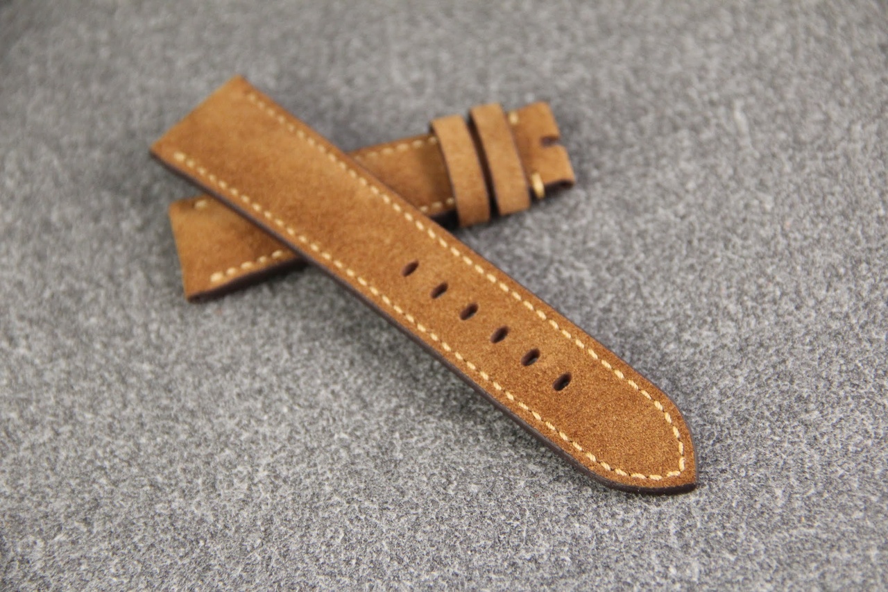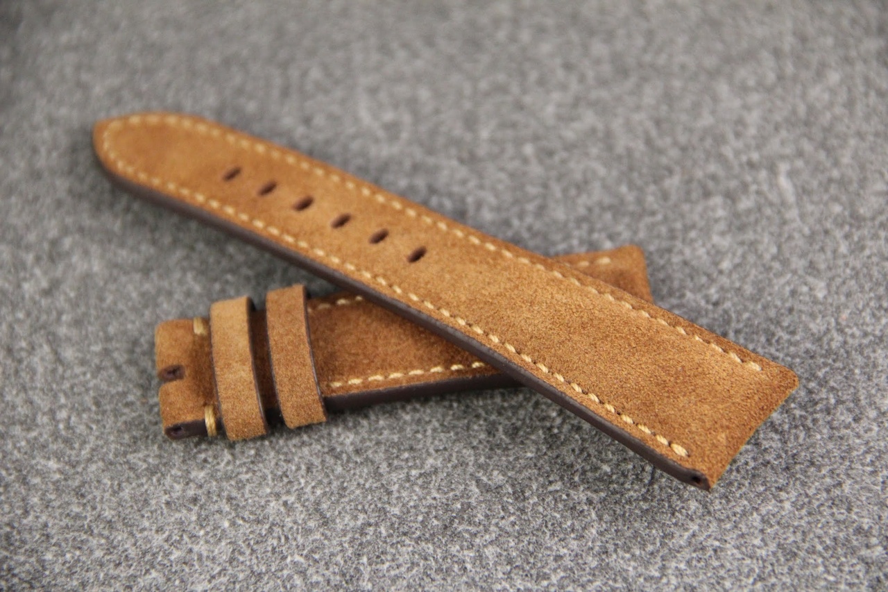 Ремешок для часов Blancpain Fifty Fathoms Bathyscaphe Day Date Desert Edition. Верх ремешка сделан из замши. Подкладка ремешка из кожи Minerva производства Badalassi Carlo - Тоскана, Италия. Ремешок прошит вручную.