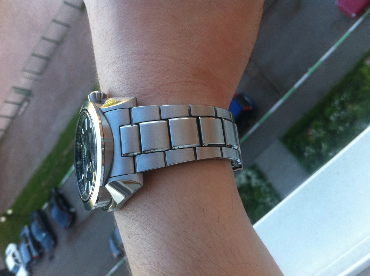 "Ушки" под браслет короткие - поэтому ничего не висит и не свисает (у самого обхват запястья - 18,5 - 19 см. Плюс прикладывали на руку друга - 16,5 см.). Форумчане неоднократно отмечали, что определяющим фактором является диаметр стекла и это абсолютная правда! Имеющаяся пилотская форумная лимитка от Steinhart при диаметре 44 мм. по корпусу, и 40-41мм. по стеклу, по моему мнению, выглядит массивнее!