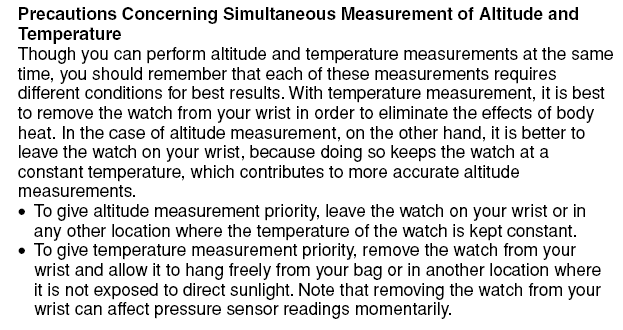http://forum.watch.ru/attachment.php...9&d=1364065270 В инструкции есть следующая фраза: In the case of altitude measurements, on the other hand it is better to leave the watch on you wrist, because doing so keeps the watch at a constant temperature, which contributes to more accurate altitude measurements перевод: В случае измерения высоты, лучше оставить часы на запястье, так как это сохраняет постоянную температуру часов, что способствует более точным измерениям высоты. Отсюда можно сделать заключение, что показатели альтиметра, зависят не только от цитирую оппонента: Цитата:
