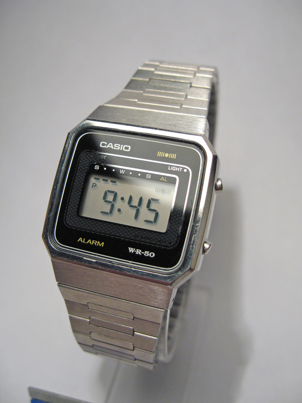 Casio A4100W - очень редкая модель из той же эпохи, начала 80-х.:) По крайней мере, в интернете об этой модели я вообще не нашёл никакой информации. Часы приехали из Японии. По размеру небольшие и функций у них немного. Однако добротный хромированный корпус, хороший браслет, линии и большинство надписей на стекле сделаны зеркальными.