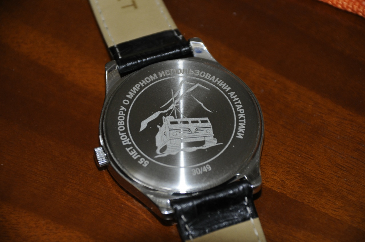 "195 лет первой Русской антарктической экспедиции". Состоит из двух часов по имени шлюпов Лазарева и Беллинсгаузена - "Мирный" и "Восток". Изготовлено всего по 18 часов каждого вида (однострелочные Луч 1801.1Н): "Мирный" - покрытие корпуса хром, белый рельефный циферблат, воронёная стрелка. "Восток" - покрытие корпуса нитрид циркония (не путать с нитридом титана), светло-кремовый рельефный циферблат, воронёная стрелка. P.S. так ни разу за год с лишним и не одел. коллекционный вариант получился. сейчас на маркет выставил - моё мнение, что часы должны носиться, а не в коробочке жить. |