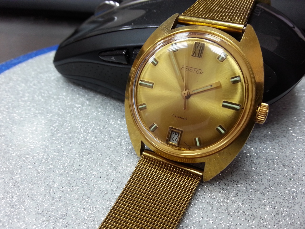 Бордовый Восток. Кто сказал, что кроме классических (черный, белый, серебристый), другие циферблаты не смотрятся?:)