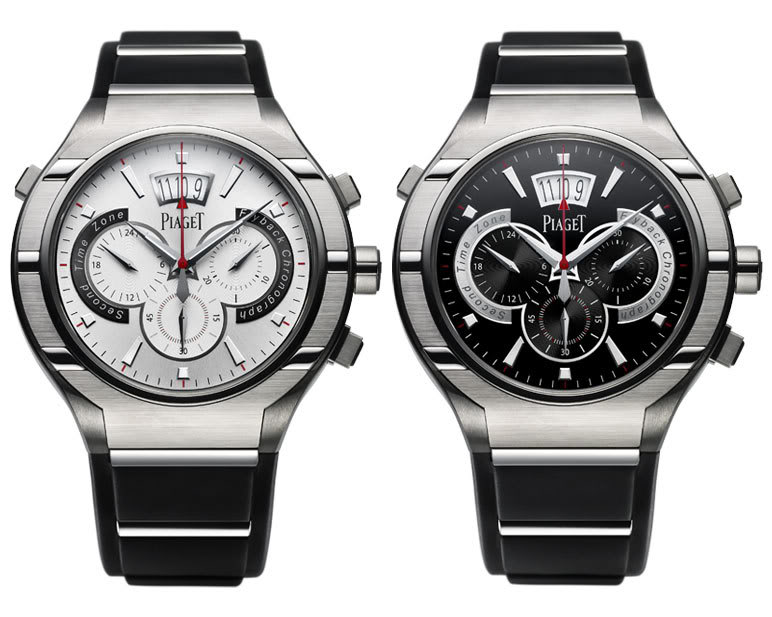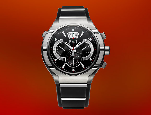 Теперь 45 мм корпус часов изготовлен из благородного титана, вместо китчевого золота, и дополнен элементами из каучука. Так же увеличилась водостойкость: теперь часы можно погружать в воду почти на 100 метров, а сапфировое стекло на циферблате теперь расположено с двух сторон. Мануфактурный механизм, как и в ранее произведенной модели, калибр 880Р – автоматический хронограф, два барреля обеспечивают завод в 52 часа, частота 28800 пк/час, 35 камней, flyback хронограф с индикатором второго часового пояса, на отметке «9 часов». Механизм тоже приобрел новое финишное оформление – ротор с PVD-покрытием антрацитового цвета с гравированным гербом Piaget. Вложение 16794 Вложение 16795 Вложение 16796 Вложение 16797 Источник |
