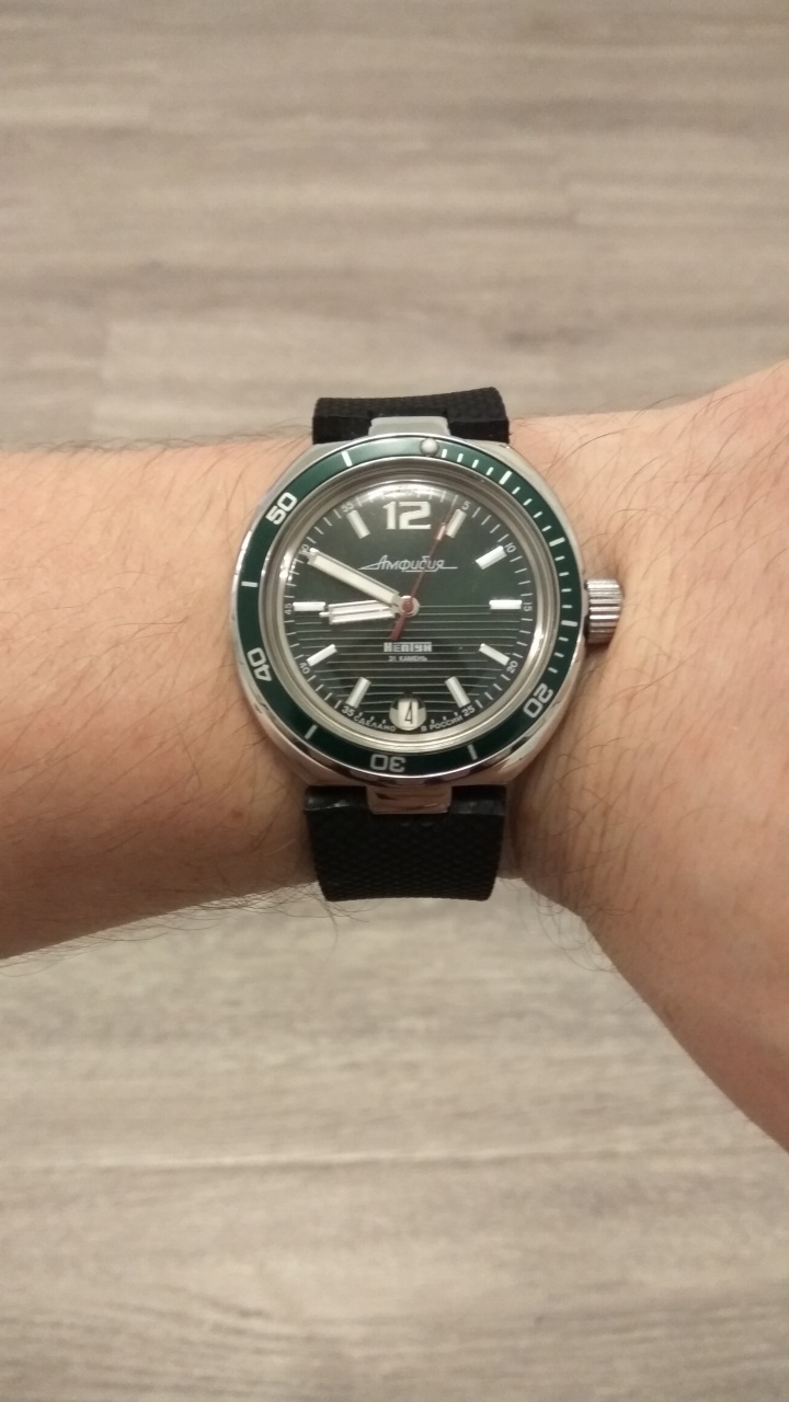 Привет всем, вот и мне пришел мой зеленый Нептун. Так давно хотел, что амфибию, что зеленые часы, что когда увидел их на мераноме не удержался и заказал. Только потом прочитал на форуме про ужасный браслет, про то что можно купить дешевле... Ну да ладно.