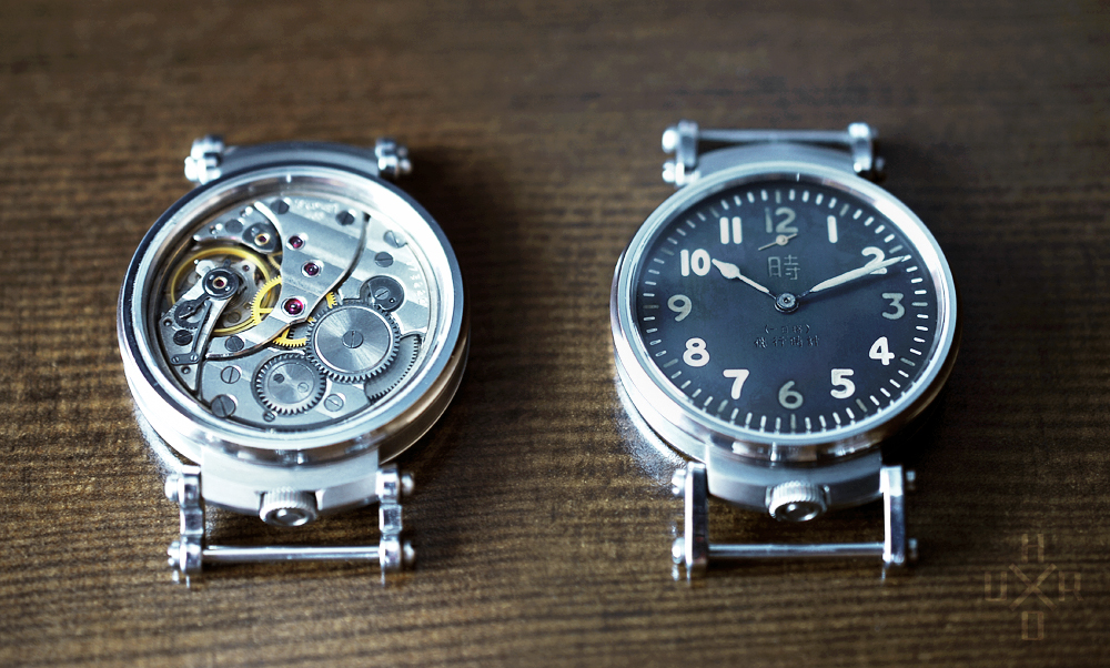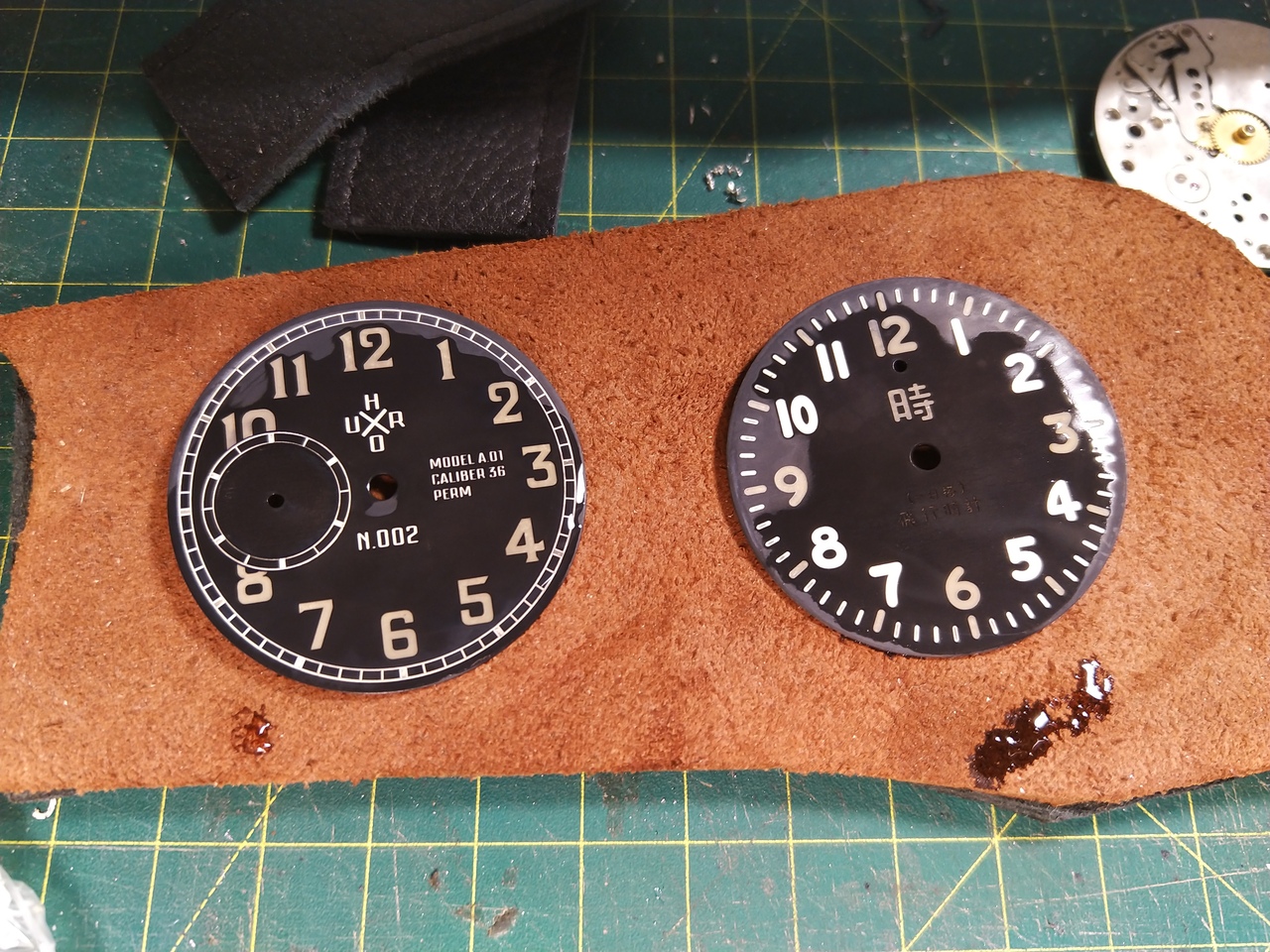 Начну с того, что эти часы я видел до начала проекта. Мне вообще нравятся военные бортовые часы и стрелочные приборы. В начале 2019 года я начал проект посвященный наручной версии этих часов, сбор же информации и подготовка началась еще в сентябре 2018! Надо сказать, что проект еще не завершен, так как не изготовлен ремешок под эти часы. Сами часы готовы) По циферблату было понятно: оставлять дизайн полностью таким как на оригинале Seikosha Type 93. Вложение 2694543 Механизм сначала выбрал советский от тонкой Молнии 3601 (по нему чуть позже). Корпус хотел изготовить из бронзы. В итоге был приобретен корпус из нержавеющей стали. По моему мнению он наиболее соответствует (из всего, что я видел) японской стилистике, архитектуре. Без излишеств, простой. Даже немного архаичный из-за своей конструкции на винтах. Вот какие ассоциации, в плане дизайна, у меня вызывают линии выбранного корпуса: Вложение 2694548 Вложение 2694551 ===ЦИФЕРБЛАТ=== После приобретения корпуса и произведенных обмеров, нарисовал циферблат в векторе, предварительно уточнив как должны выглядеть маленькие нижние иероглифы (так как на растровых картинках плохо видно). Большой, верхний, иероглиф 時 означает ВРЕМЯ. Нижние иероглифы (一日搭) 飛行時計: "лётные часы" и "суточный запас хода" Паралельно, с прорисовкой циферблата, дал задание ювелиру, чтобы он подготовил серебряную пластину толщиной около 0,55-0,6 мм., после готовности которой отдал пластину, с циферблатом в кривых, на лазер (технология по лазеру была уже отработана на циферблатах для часов модели А.01 из другой ветки форума). К сожалению, первый циферблат оказался с дефектом: расслоение серебряной пластины. Пришлось переделать, результат на высоте. Вложение 2694558 Просверлил 2 отверстия под стрелки, с оборотной стороны кернились 2 метки под ножки (при помощи шаблона, изготовленного из старого циферблата молнии, в котором на месте ножек были сделаны небольшие отверстия), а так же сделано небольшое круглое углубление (по аналогии с циферблатами Молний, для немного выпирающего камня баланса и винта на механизме со стороны циферблата. Купил для этого фрезу в ювелирном. Надо сказать, что фреза не полностью меня удовлетворила в работе, надо искать другой вариант), после чего циферблат необходимо было довести до толщины 0,5 (-0,05мм). Делалось на ровном камне при помощи наждачной бумаги на мокрую (зернистость от 1000 до 2500). Лицо доводилось до зеркала. После всех этих манипуляций, берем серебряную проволоку диаметром 0,15-0,18 мм. отожженую, делаем на конце конус примерно 20-30 град. И, при помощи спец.инструмента и ювелирного лазера, привариваем. Вложение 2694577 В углубления циферблата (цифры, иероглифы, метки) наносим эмаль в несколько слоев с промежуточной сушкой (эмаль дает усадку). В тех местах где необходим люминофор, порошок разбавлял эмалевым лаком. После высыхания обрабатываем мелкой наждачной бумагой на камне на мокрую. Теперь надо сделать поверхность матовой, для последующего чернения. Для матирования я использую разбавленную азотную кислоту (ВНИМАНИЕ - работать аккуратно), погружая циферблат и убирая кисточкой продукты реакции с лица циферблата. Эта процедура занимает не больше минуты. Промываем циферблат в воде и растворе пищевой соды, затем снова в воде. Производим отбеливание (соль для отбеливания серебра продается в ювелирных магазинах, оранжевая. Вроде