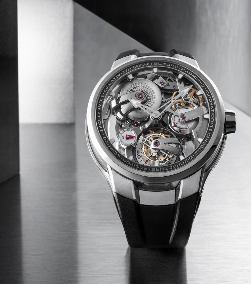Вложений: 2 Greubel Forsey Tourbillon 24 Secondes Architecture. Вложение 3503399 Вложение 3503400 Tourbillon 24 Secondes Architecture In titanium Hand-wound movement with 2 patents Tourbillon 24 Secondes • hours and minutes • small seconds • 24-seconds tourbillon rotation • power-reserve Exterior Case • Titanium and synthetic sapphire crystal • Three-dimensional, variable geometry bezel with raised engraved text • Synthetic sapphire crystal over the entire periphery of the caseband • Three-dimensional, variable geometry lugs, hand-polished with handfinished straight graining • Transparent back with synthetic sapphire crystal • Titanium security screws • Raised engraving “Architecture 1” and “Greubel Forsey” Case dimensions • Caseband diameter: 47.05mm • Bezel diameter: 45.50mm • Height: 16.80mm Water resistance of the case • Water-resistant 5atm - 50 m - 164ft (standard NIHS 92-20/SN ISO 22810:2010) Crown • Titanium, polished and frosted, with GF logo Dial side • Three-dimensional, variable geometry hour-ring, indexes with Super-LumiNova • Power-reserve indicator, circular-grained, engraved and lacquered • Gold small second indicator, circular-grained, polished flank • 24-seconds tourbillon rotation indicator Hands • Hours and minutes, curved profile, polished steel with Super-Luminova • Small seconds, red triangle • Power-reserve rack, circular-grained, polished bevelling, straight-grained flanks • 24-seconds double-tipped, black anodised aluminium Strap and clasp • Non-animal material, rubber with text in relief, titanium folding clasp, engraved GF logo Movement Movement dimensions • Overall diameter: 38.70mm • Thickness: 12.35mm Number of parts • Movement: 354 parts • Tourbillon cage: 86 parts • Weight of the cage: 0.38g Number of jewels • 42 • Olived-domed jewels in gold chatons Chronometric power reserve • 90 hours Barrels • Three coaxial series-coupled fast-rotating barrels (1 turn in 3.2 hours), one of which is equipped with a slipping spring to avoid excess tension • Engraved pattern with Greubel Forsey, lacquered, circular-grained Balance wheel • Variable-inertia with gold mean-time screws (10mm diameter) Frequency • 21’600 vibrations/hour Balance springs • Phillips terminal curve • Geneva-style stud Bridges and main plate • Titanium • Frosted, polished bevelling and countersinks • Polished spherical bridges, polished bevelling and countersinks • Three-dimensional centre bridge, frosted, polished bevelling and countersinks Movement side • Three-dimensional power-reserve bridge, frosted, polished bevelling and countersinks • Tourbillon bridge, polished bevelling and countersinks, circular-grained • Engraved pattern with individual number, circular-grained, straightgrained flanks Tourbillon • Inclined at a 25° angle, 24-seconds rotation • Light alloy cage pillars • Titanium cage bridges • Gold counterweight Gearing • Involute circle profile • Tangential inclined gear on fixed wheel and profiled teeth on escape wheel pinion Displays • Hours and minutes • Small seconds • Power reserve on a sector • Tourbillon rotation |