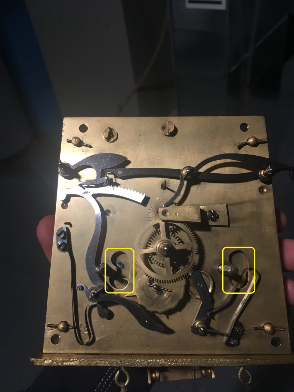 Предыдущий владелец что-то мудрил с пружинкой, поддерживающей ось молоточка боя. Хотелось бы понять, как было изначально. |