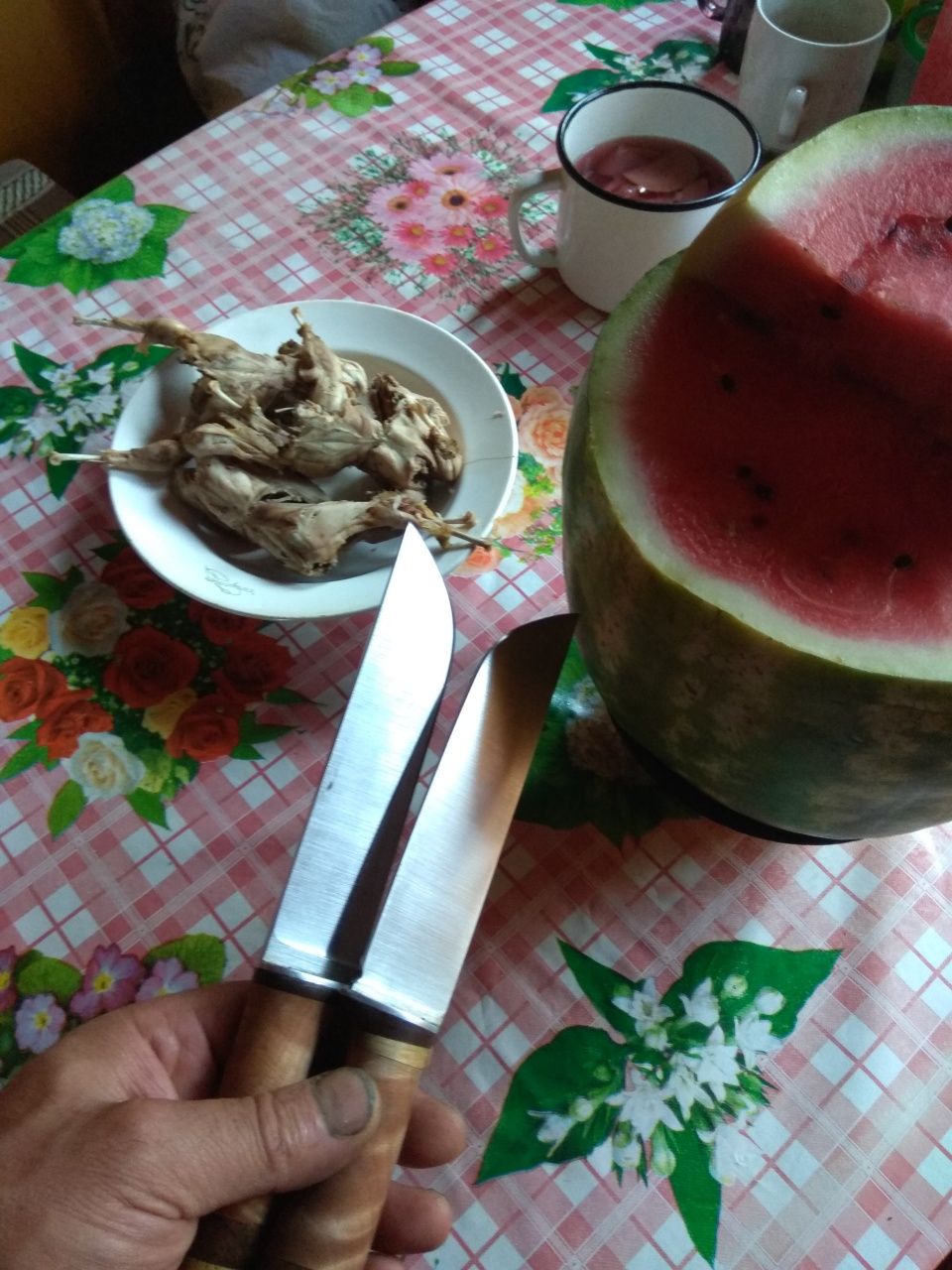 Вложение 3027940 Вложение 3027941 салатик нарезать с мясом куропатки, арбузик на десерт. |