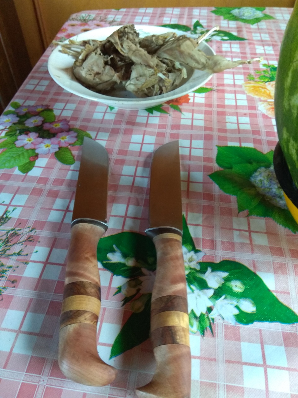 Шашлычно столовые ножики собрал друзьям на днюхи. Тепловозный клапан, твердость 60НРС, нержа, беререза\яблоня+вакуум с маслом и воском.