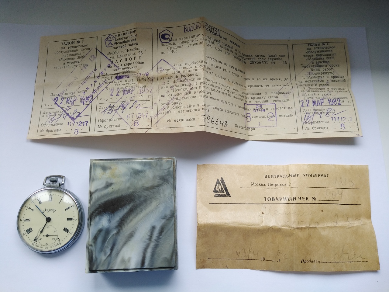 Подвернулся вариант в комплекте - заполненный гарантийник, товарный чек Московского центрального универмага и заводская коробочка. Но сами часы не рабочие... Кому интересно - могу поменяться.