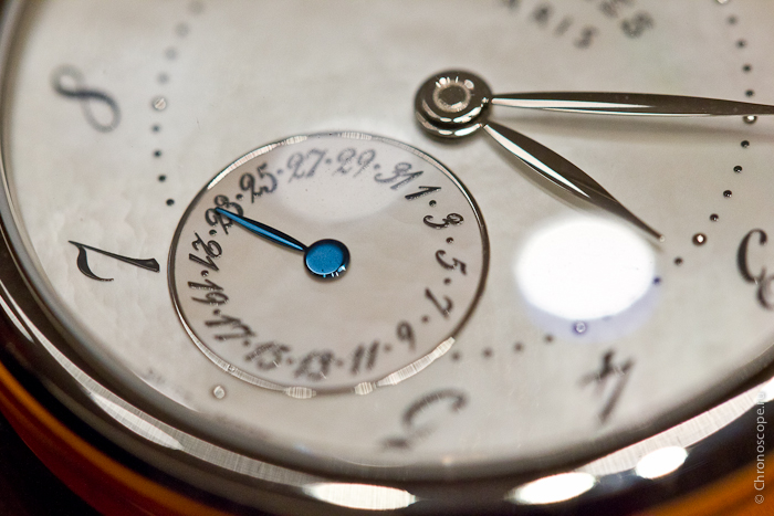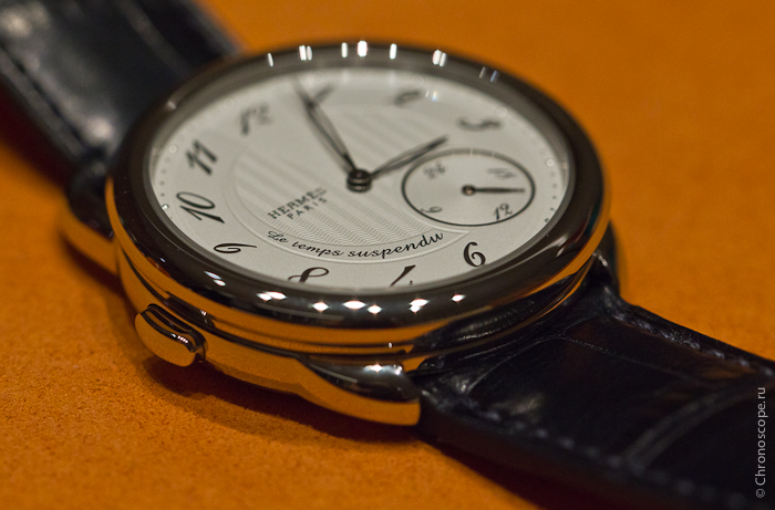 Круглый корпус новинки изготовлен из 18-каратного белого золота, диаметром 85 мм, толщиной 12,8 мм. Серповидная подставка, также выполнена из 18-каратного белого золота. Сапфировое стекло с антибликовым покрытием установлено на передней стороне корпуса и на его задней крышке. Циферблат также из 18-каратного белого золота с воронеными накладными арабскими цифрами и стрелками. Модель оснащена мануфактурным швейцарским механизмом с ручным заводом Vaucher (эта мануфактура принадлежит Hermes и Parmigiani) H1950, на 25 камнях, с балансовой частотой 18000 полуколебаний в час (2,5 гц), пятью заводными барабанами, запасом хода 200 часов, функциями индикации часов и минут (посредством соответствующих центральных стрелок). Калибр отлично отделан и декорирован; в частности, платина и мосты вручную скошены, отделаны циркулярным зернением. Завод часового механизма осуществляется посредством вращения безеля. Источник: http://forums.timezone.com/index.php...=0#msg_6556606 |