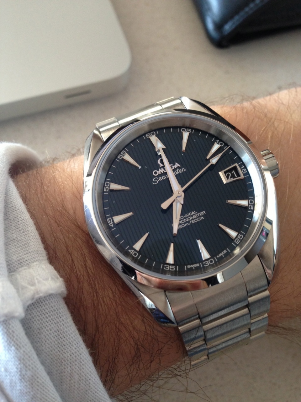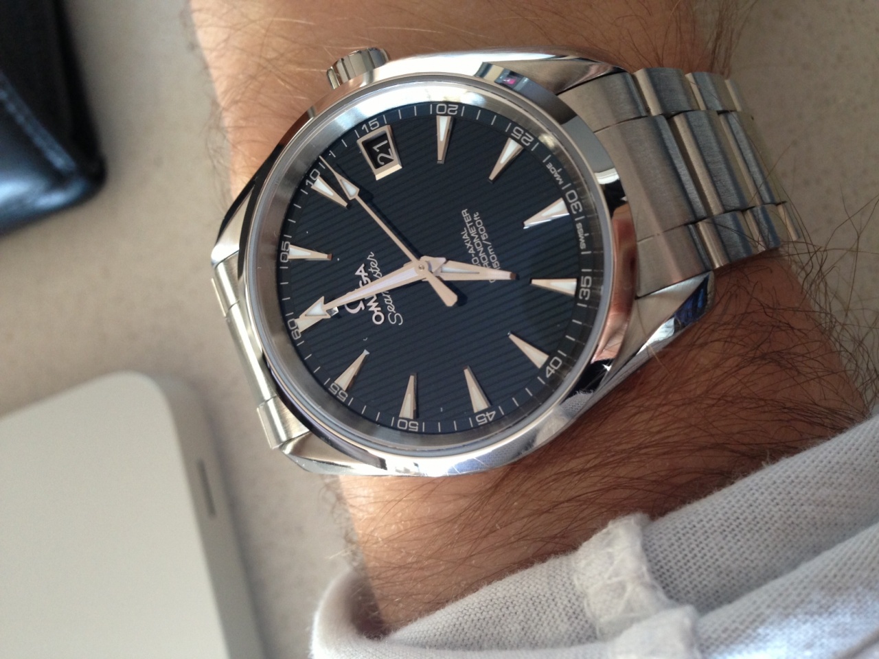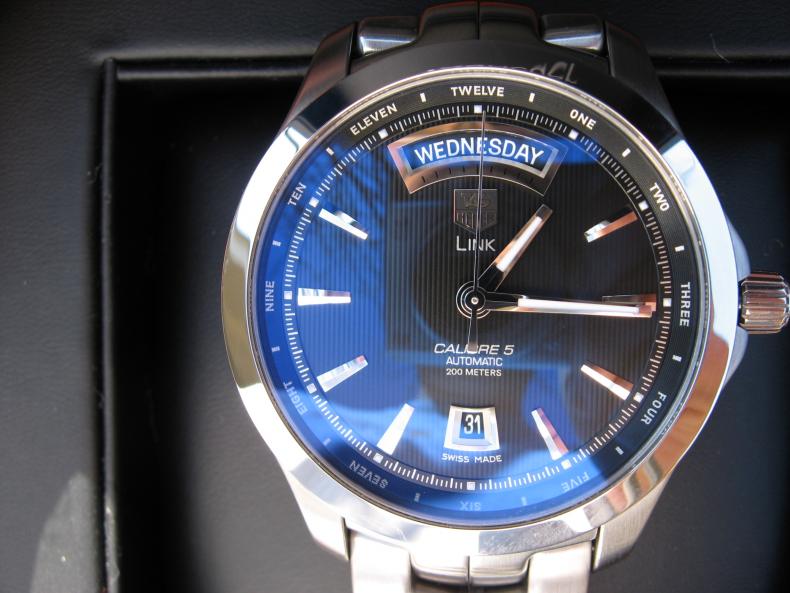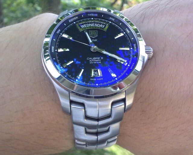 На картинках у меня было такое же впечатление и поначалу даже склонялся больше к новому варианту с римскими цифрами на безеле. Но когда увидел и сравнил две модели рядом, сразу понял и согласился что в новой вариации дизайнер перестарался и как не странно, но старая модель с полированным безелем и датой сверху смотрится богаче и солиднее. Рамка вокруг дня недели не настолько большая и в жизни даже добавляет оригинальности часам, и кстати как показывает носка отлично читается и блестит привлекая внимание зевак :) Кстати я поначалу даже не заметил, но мне попался экземпляр с темно-синем циферблатом, так вот интересный момент, что в помещения они более строгие черные, а на улице на солнце гильош переливается синими отливами и смотрится очень завораживающе. (например у Омеги Аква синий цвет всегда синий, а здесь под разным освещением меняется). |