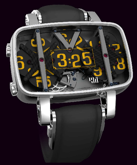 здесь) и др. В часах V.01, благодаря диафрагме, вид часов может варьировать от простого трехстрелочника до полного отображения хронографа. Вращающийся безель и жалюзи являются результатом более чем двухлетних исследований, разработок и испытаний. При изготовлении использованы титан, родий, керамика и другие материалы. В частности, система оснащена керамическими шарикоподшипниками, не требующими смазки. Автоматический механизм Valjoux с частотой 28 800 полуколебаний в час, на 27 камнях, с запасом хода 44 часа. Корпус из титана или розового золота с PVD-покрытием. Сапфировое стекло с двусторонним антибликовым покрытием. Водозащита до 50 метров. Ремешок из кожи аллигатора с пряжкой. Вложение 32110 Вложение 32109 Вложение 32111 Вложение 32112 Источник: http://leblogdesmontres.fr/2010/01/0...hronographe-2/ |
