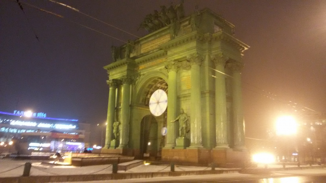 Только что. Нарвские ворота. На город постепенно опускается туманчик.