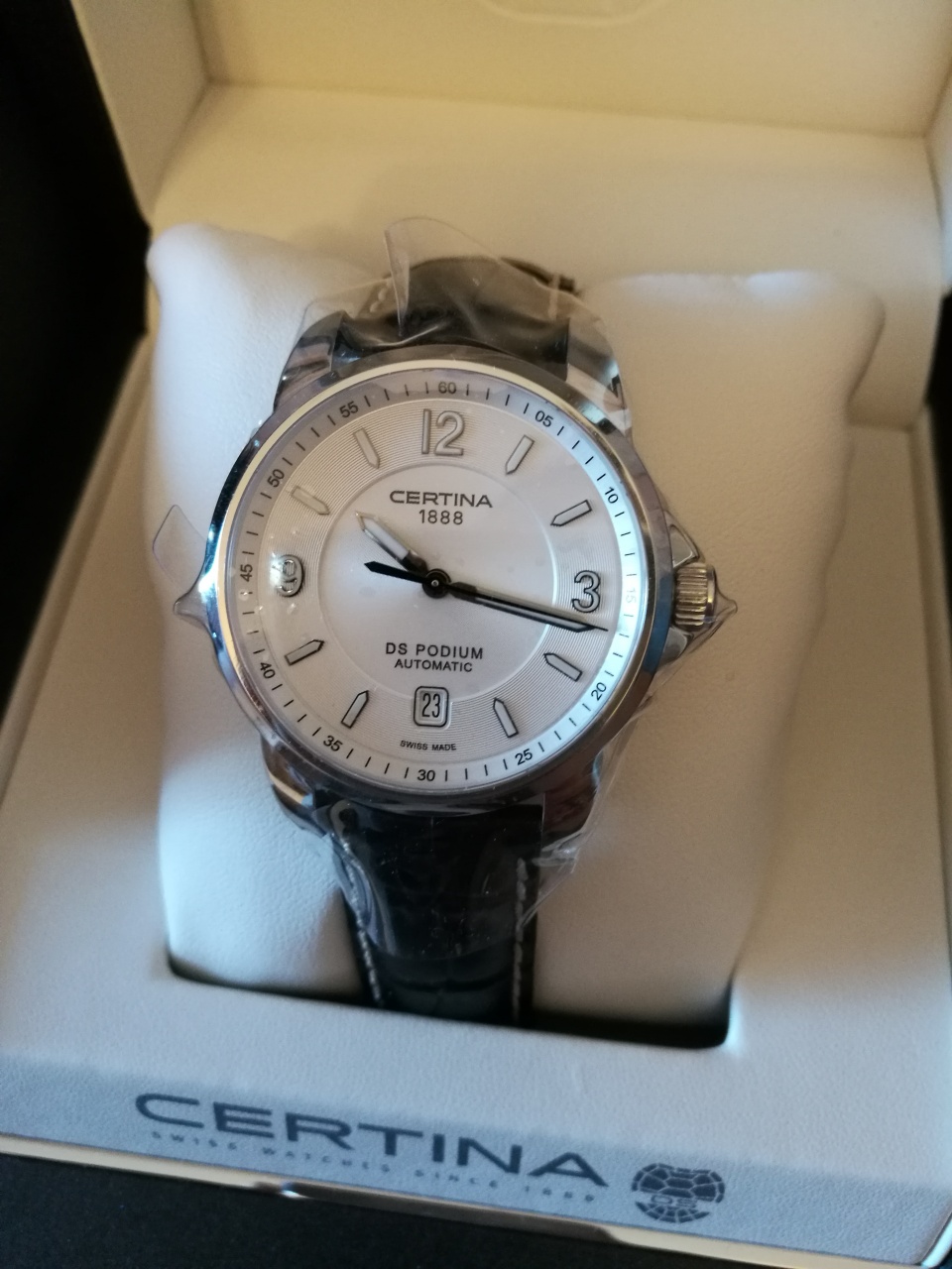 CERTINA DS-4 Small second Auto C022.428.16.031.00 Белый цифер / Черный ремешок / ETA 2825-2 / d=40mm На маркете за 27, возможно с помощью торга получится снизить цену на пару тысяч А если еще скажете, что Вы девушка и выбираете подарок для молодого человека, то сердце у продавца просто обязано растаять и он скинет еще) Присмотритесь к этом часам: Швейцария, "универсальный" размер 40 мм, день месяца - удобно, часы с датой выбирают 2/3 покупателей, механика с автоподзаводом - не нужно каждый день заводить, но механика (извечный спор о "душе" в часах), сапфировое стекло - не царапается, застежка бабочка - очень удобно, декор циферблата гильоше - красиво; стекло с нижней стороны часов - красиво |