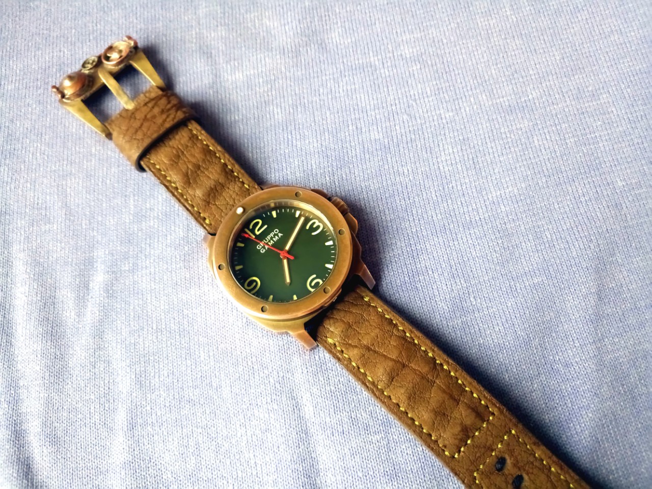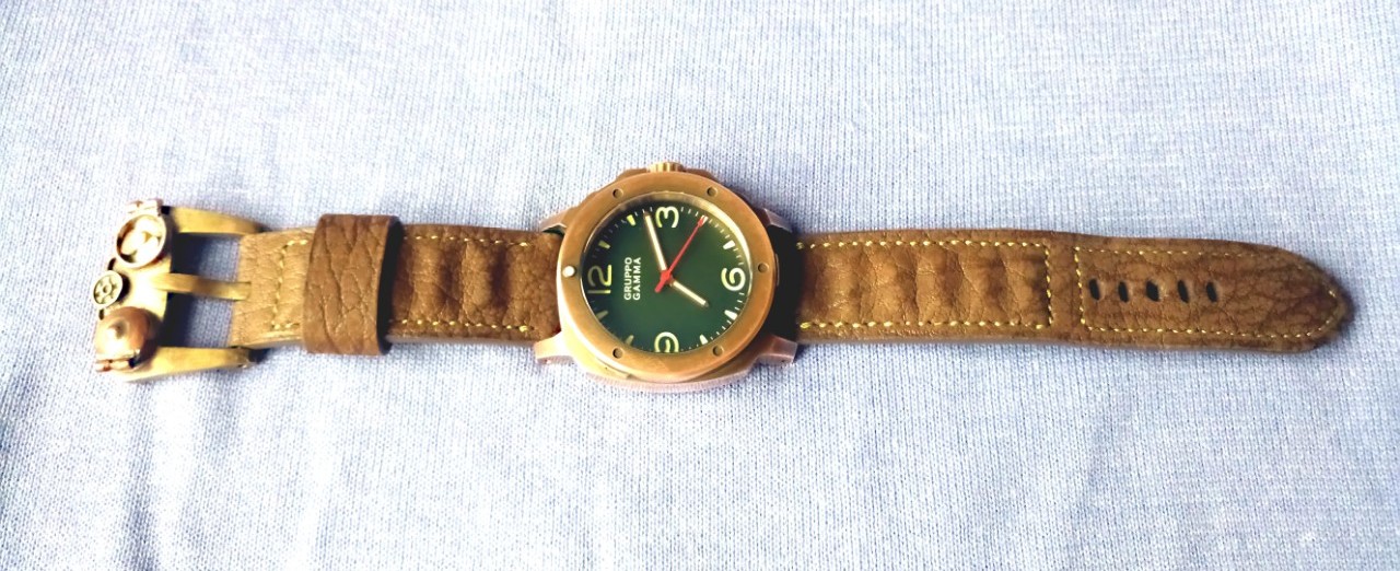 Латунные часы серии Shark Diver. Т.е. Акула. И т.е. латунь. http://i6.pixs.ru/storage/7/4/1/2123...1_30075741.jpg Коричневый теленок аммо. Пряжка в ироничном стиле "Пловцы, улепетывающие на торпеде от огромной акулы". Пряха к таким часам ложится и бронзовая, и латунная. После патинирования и не понять- какой именно металл был изначально) http://i6.pixs.ru/storage/7/9/0/dsc0...2_30075790.jpg Для любителей "морской соли" - немного аммиака и все зеленеет) |