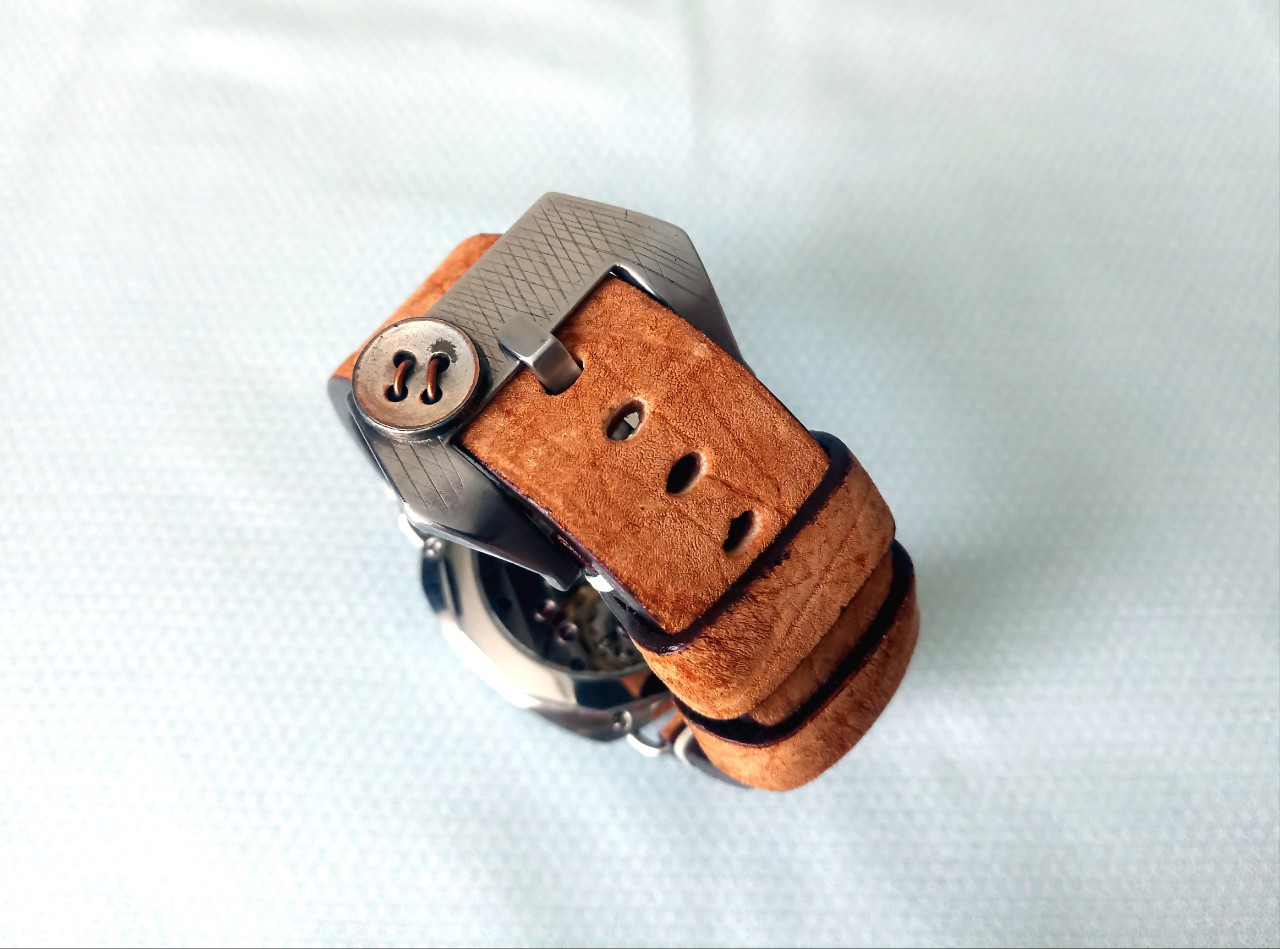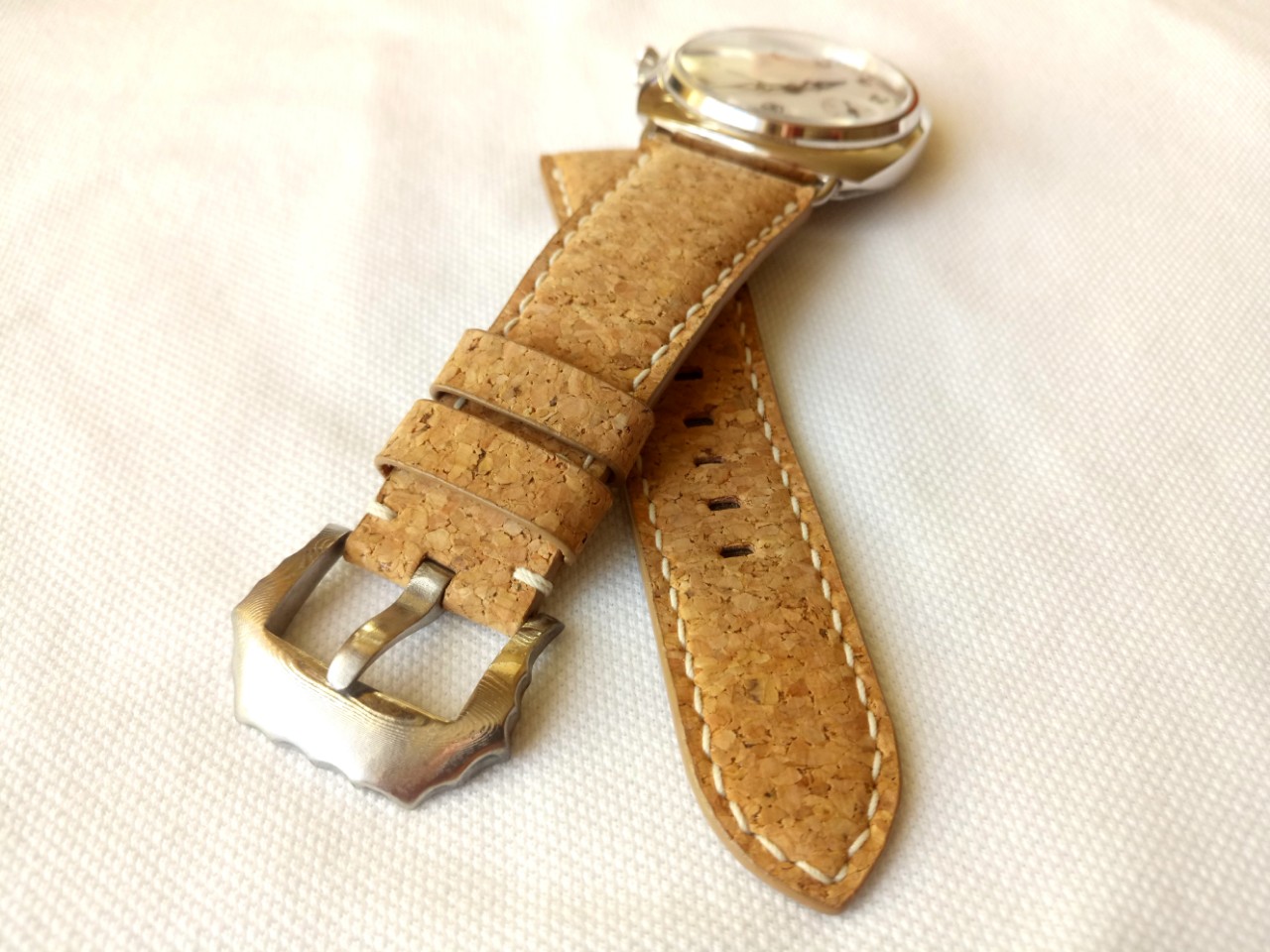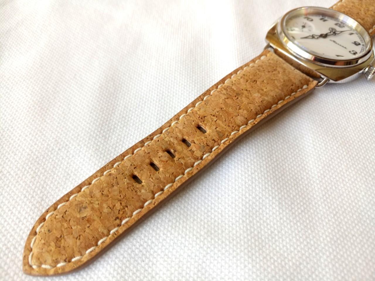 - Ремешок из интересного материала - из пробкового дерева с подкладкой из кожи теленка с белой ниткой под цвет циферблата. Когда делал заказ, то очень сомневался в пригодности к носке ремешка из такого материала, но он оказался весьма стойким к внешней среде.