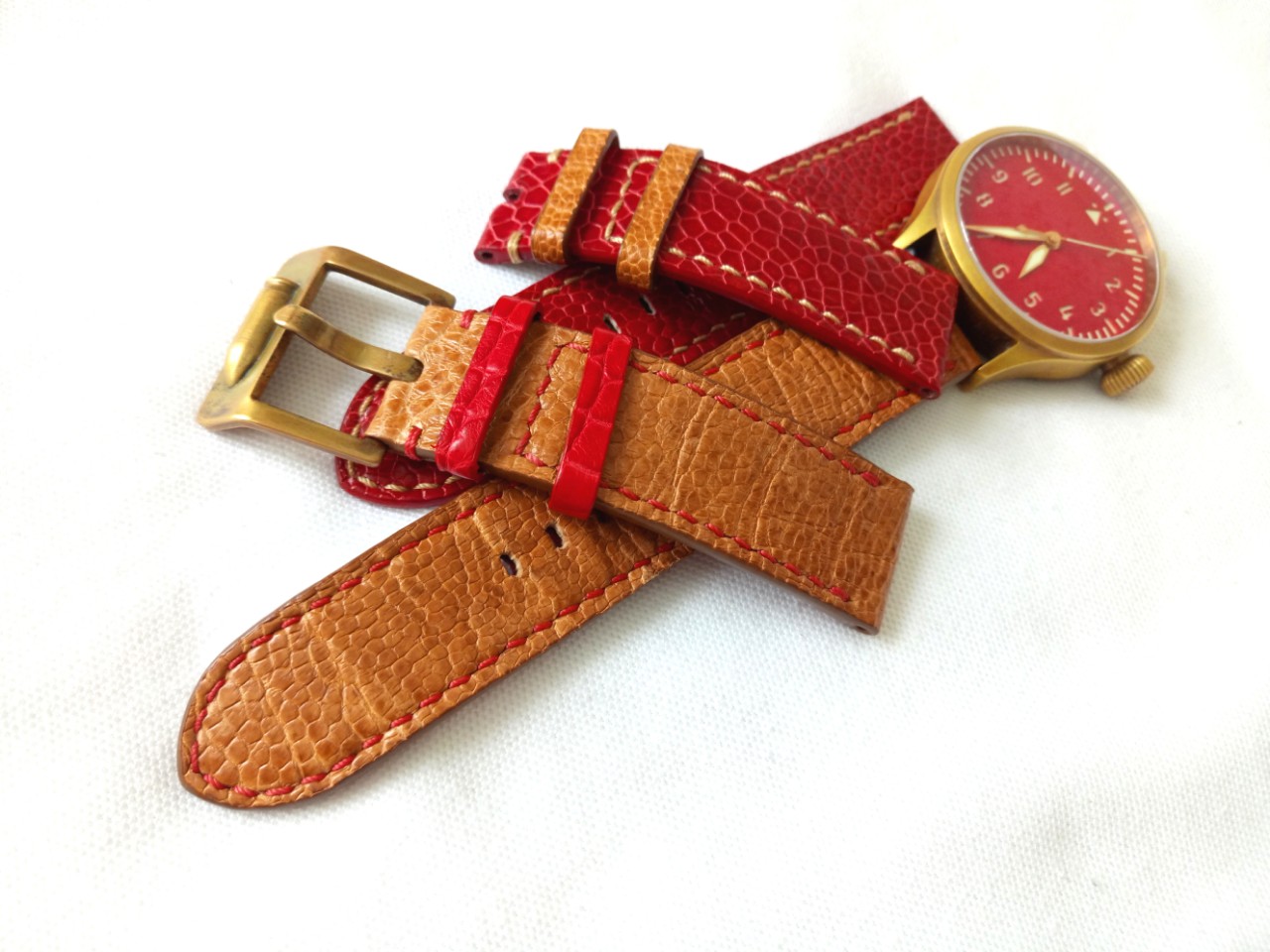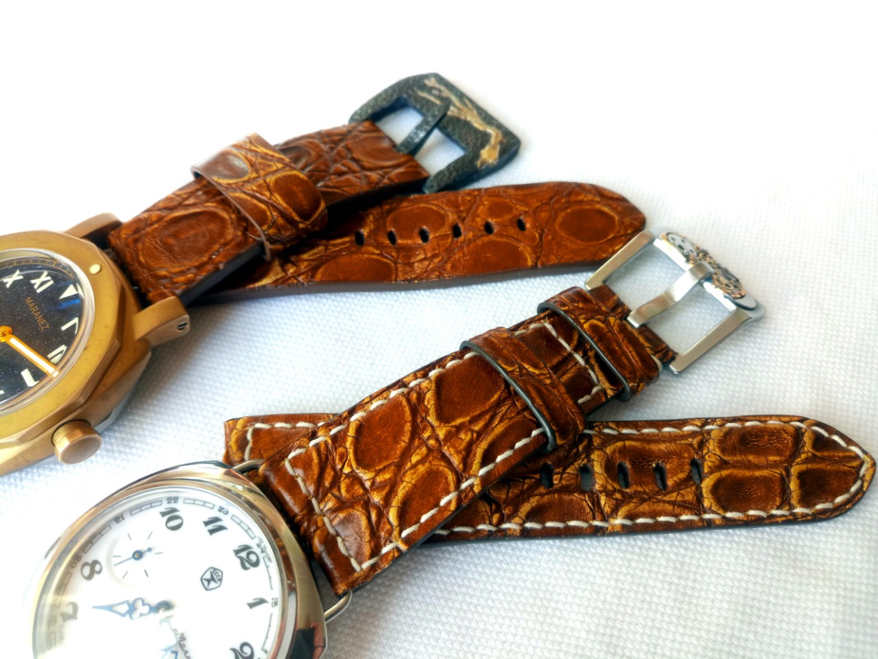 Два ремешка из одинаковой кожи крокодила с интересной окраской - коричнево-бронзовый цвет. Но визуально ремешки очень разные - из-за толщины и наличия/отсутствия строчки.