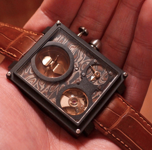 Если коснуться технической стороны, как вы хотите добиться симметричности отображения часов и минут? Смещать диски относительно друг друга? Тогда, нужен дополнительный передаточный модуль. И как это всё уместить в предполагаемую вами толщину в 10мм.? В рендере, толщина не похожа на 10мм. Опять же, если часы будут более 10 мм, то, по моему, надо опускать дужки крепления ремешка. Вот пример, нормальных прямоугольных часов с мокуме-гане.