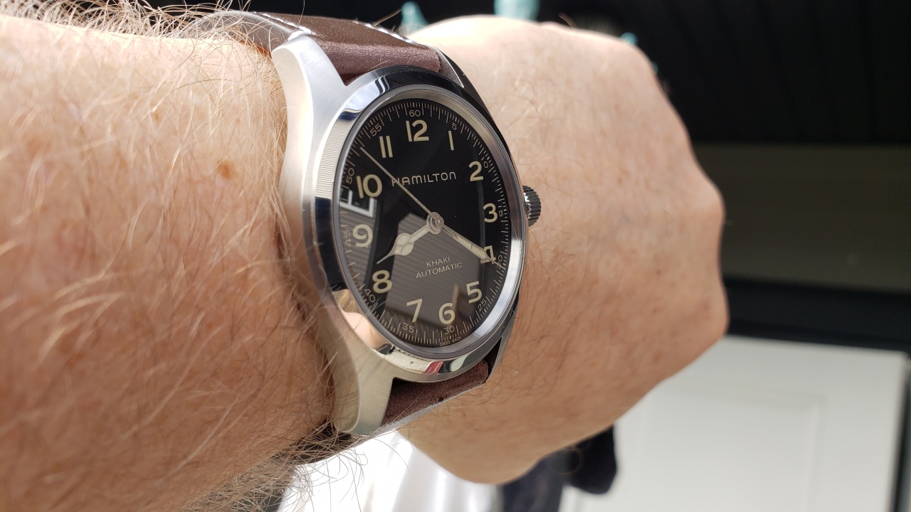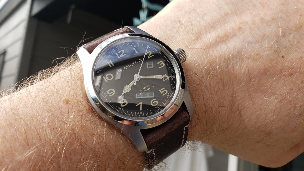 Зря я по-поводу неудобства дергался Длина часов скомпенсирована тонким мехом-корпусом Нет.С запястьем 16-16.5 см могут конечно возникнуть непонятки Но....вот до чего всё-таки Американский подход виден в Хэме Размер разбабахали и...ремешок поставили с "рёбрами жесткости":D Вот первое впечатление и спорное.Но бесспорно одно-по-началу часы просто отталкивают тем,что не сидят.Парят над рукой И ремешок этот форму принимает не пару дней,а пять-шесть...Зато потом он вполне адекватен,поверьте И не выглядит блестящей дешевкой.Ребра жесткости в-тему при внешней блестючести...не люблю блестящие ремеши.. Ну пока так. |