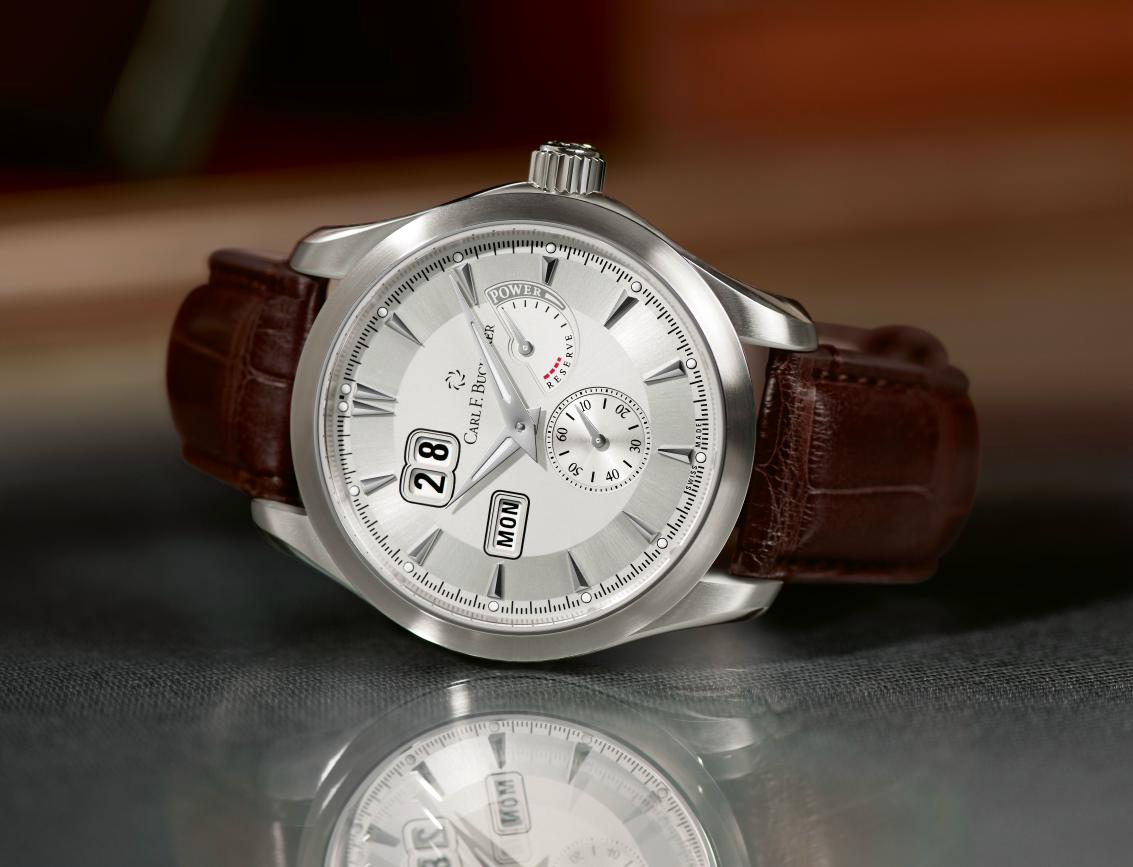 Новая модель Manero CentralChrono от швейцарской часовой компании CARL F. BUCHERER отличается тем, что имеет функцию хронографа с центральной индикацией секунд и минут, и выпущена в двух вариантах: с серебристым циферблатом на коричневом ремешке (Ref. 00.10910.08.13.01) и с черным циферблатом на черном ремешке (Ref. 00.10910.08.33.01).
