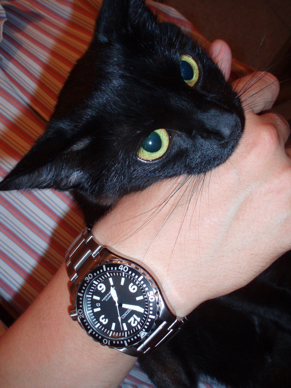 Котэ просто прелесть, думает как ему такие часы получить:) Эти Сейко отличные часы и очень красивые, носите в радость и Коте радуйте ! По поводу точности, сообщите пожалуйста через две-три недели, очень интересно и полезно будет, наблюдайте. Спасибо за фото. |