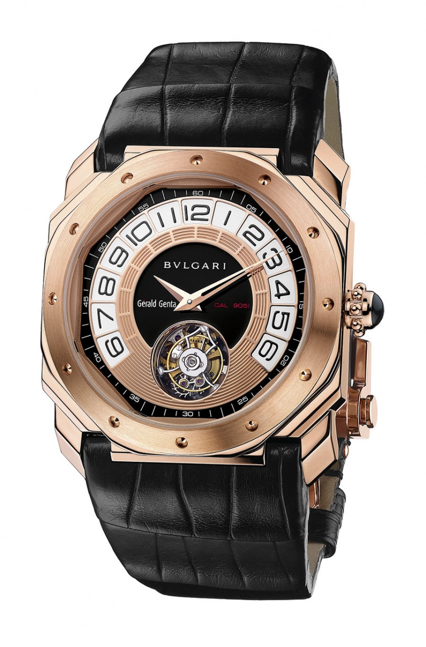 Новая модель Octo Tourbillon Retro от бренда Bvlgari (линейка Gerald Genta) имеет корпус, изготовленный из 18-каратного розового золота, диаметром 43 мм. На торце заводной головки, расположенной на 3 часах, имеется кобошон. Савпфировое стекло защищает циферблат из розового золота с решетчатой отделкой. Стрелки также изготовлены из розового золота.