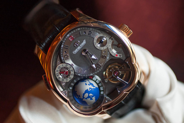 Часы Greubel Forsey с многоосным турбийоном и многоуровневым циферблатом являются настоящим ворлдтаймером с маленьким трехмерным титановым глобусом. Ворлдтаймер – это часы с индикациеий времени во всех часовых поясах одновременно. Функция GMT осуществляется при наличии индикатора второго часового пояса. У Greubel Forsey GMT есть и то, и другое. 12-часовой счетчик в районе 9-ти часов показывает время второго часового пояса. Миниатюрный глобус на отметке 7 часов и диск с названиями городов на обороте корпуса – атрибуты настоящего ворлдтаймера.
