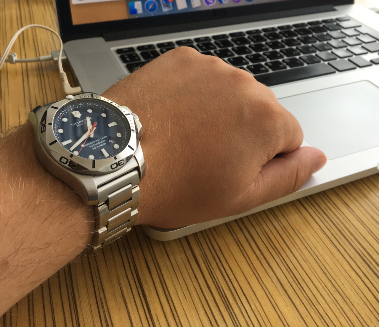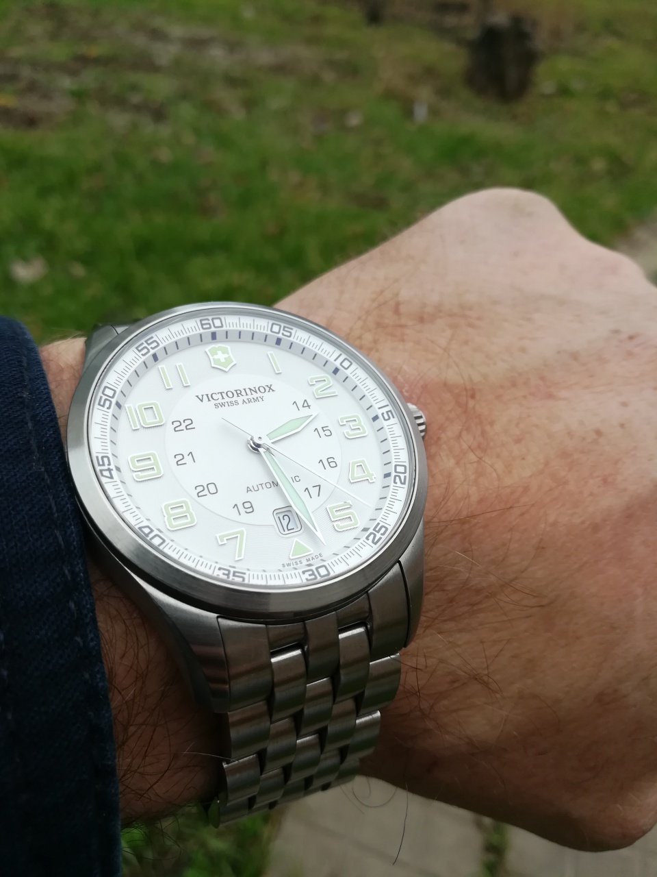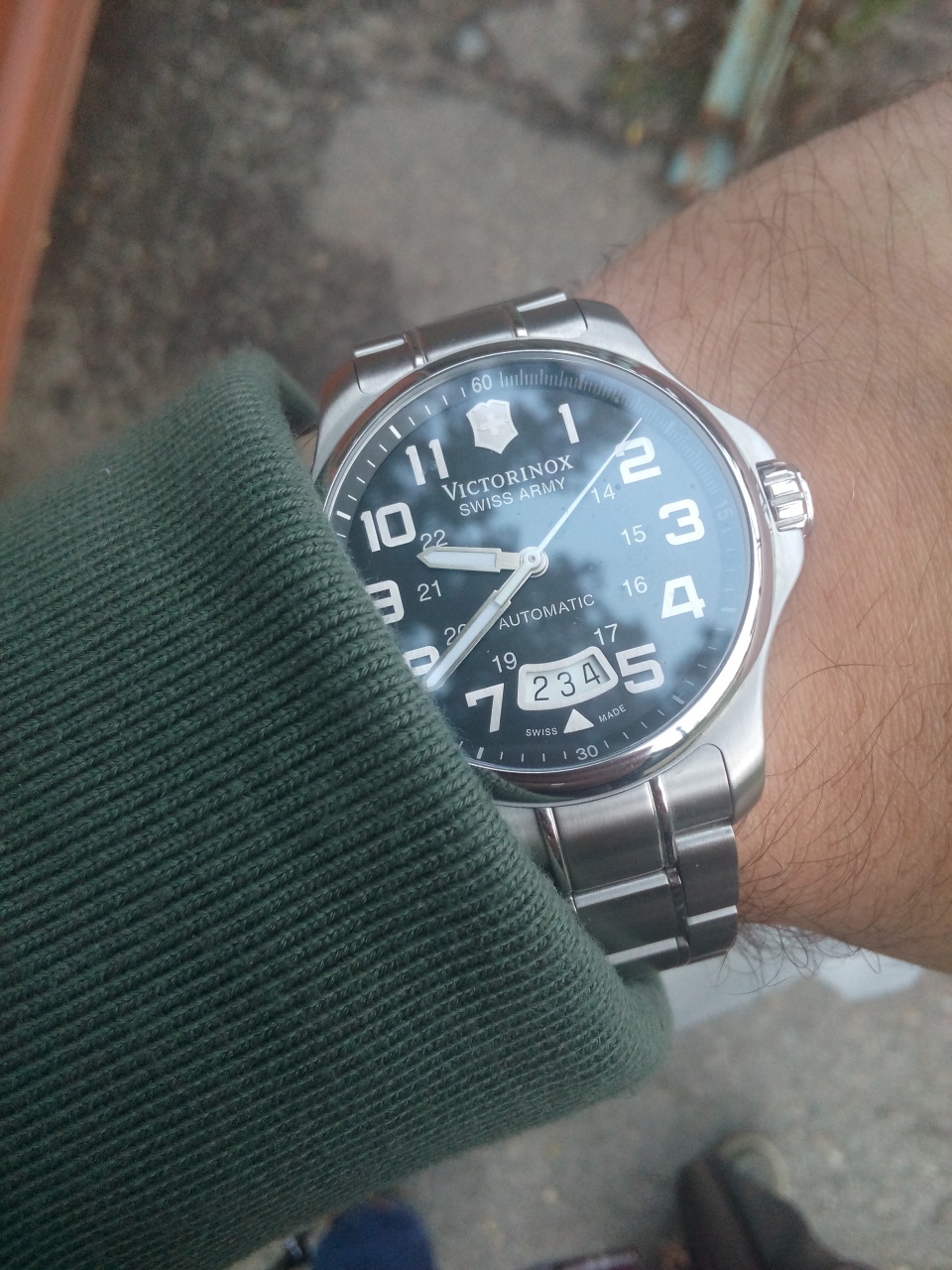 Я все же решил присоединиться к вам и оставить у себя в сете, купленный еще осенью с хорошей скидкой в Консуле Викторинокс Маверик с красивым красным цветом циферблата и безеля. Отличный вариант на лето, для моря, отдыха и вообще ношения с короткими рукавами!:) Взял его спонтанно в Консуле по цене примерно как Ебей, даже чуть дешевле, учитывая вариант на браслете. Сперва решил продать здесь, так как расширять сет не планировал. Долго он у меня висел в продаже, пока я не созрел до того что скоро день рождения, а подарка то в виде новых часов у меня нет:( А на дворе уже и весна, а затем и лето придет, так что решил я, вполне себе отличный и подарок самому себе и летний вариант.:) Снял его с продажи, укоротил браслет и уже неделю ношу каждый день, приходя к понимаю что и дизайн и форм-фактор часов и цвет и качество исполнения, мне нравяться все больше и больше.:) Из минусов могу отметить что секундная стрелка как и у многих, не попадает в метки на половине циферблата-забил на это;); и пожалуй островатые грани браслета и корпуса часов, но в принципе не страшно-руку не порежешь:D Ну и как у многих бюджетных швейцарцев и японцев, штампованная верхняя часть застежки браслета и дайверского удлинения, что в принципе тоже не напрягает, так как застежку не видишь и пользуешься ею 1-2 раза в сутки когда часы надеваешь/снимаешь, так что этот недостаток весьма условный, главное чтоб не расстегивались сами:D. Ну и слабый люм только на стрелках и метке на безеле. Из плюсов, как уже отметил выше, дизайн, цвет, хорошее общее исполнение, НЕ завинчивающаяся корона, чтоб резьбу не дергать взад/вперед при переводе даты, надежная, неприхотливая кварцевая Ронда и срок службы батареи 4 года:) Также качественный, полностью сатинированный, толстый браслет, его монолитное прилегание вплотную к корпусу без видимых и не видимых зазоров вообще. Отличный, красивый с лаковой вставкой в цвет цифера, в меру тугой безель, с приятными щелчками и отсутствием люфта как такового в принципе, что не часто встречается в недорогих часах. Метка на безеле ровнёхонько на 12 часов.:) Ну и хваленое хорошее качество стали Викторинокса, за неделю ношения пока что ни одной даже волосяной царапины, даже на замке браслета - не обнаружил, хотя часы естественно, специально не берегу.;) Посмотрим что с ними будет дальше после летнего сезона ношения. Хотя часы и браслет полностью сатинированы и весьма неплохо, за исключением лишь полированного ребра безеля с насечками и полированных фасок на боковых гранях ушек корпуса сверху. Вообще часы производят впечатление монолитности, надежности и добротности, это чувствуется когда берешь их в руки. Бюджетность же, в отличии от тех же Сейко в равной ценовой категории, не чувствуется абсолютно. Тяжелые как механика. Браслет не люфтит и не дребезжит. Я бы их поставил на равных в сравнении с такими часами как Ориент М-Форс, именно по ощущению надежной, качественной вещи, хотя именно в деталях проработки корпуса и сатинирования, Викторинокс, по моим ощущениям, сделан лучше М-Форса. Если же их сравнить с известным Океаном 1, и не брать во внимание стоящий внутри механизм, а лишь уровень исполнения корпуса, браслета и циферблата, то Викторинокс сделан более качественно именно по корпусу, браслету и циферблату, лучше сатинирование, лучше внимание к деталям, менее подверженная цар