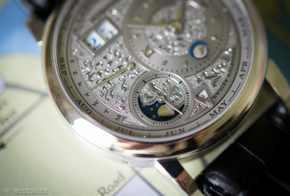 http://s004.radikal.ru/i208/1401/05/93b36cae2036.jpg http://s019.radikal.ru/i639/1401/6d/9539f5965a4a.jpg http://s020.radikal.ru/i715/1401/a4/c37acafc7549.jpg Часы представляют собой вечный календарь, включая функцию фазы луны, цикл високосного года, день недели, увеличенную дату, индикатор день/ночь. Интересным способом воплощена индикация месяцев. Названия месяцев написаны по внешнему периметру циферблата, а маленькая стрелка на 6-ти часах указывает текущий месяц. http://s019.radikal.ru/i620/1401/2c/01712df2de24.jpg Корпус новинки изготовлен из платины, его размер составляет 41.9 х 12.2 мм. Всего мануфактура выпустит 15 экземпляров новой модели. Внутри часов находится мануфактурный автоматический механизм Lange L082.1. Калибр состоит из 624-х деталей. http://i024.radikal.ru/1401/3a/b3288f741d77.jpg Циферблат часов изготовлен из белого золота 18к, декорирован в технике тремблаж и гравирования. В увеличенной апертуре даты цифры нанесены синим цветом вручную, добавляя определенный шарм часам. http://i024.radikal.ru/1401/ab/b9c24809db15.jpg http://i023.radikal.ru/1401/69/472601f38b66.jpg [media]http://www.youtube.com/watch?v=jDa8EMMpISA[/media] Стоимость составляет $ 357 000 Источник: http://luxwatch.ua/position-details/...etual-calendar Подробнее здесь http://www.hodinkee.com/blog/hands-o...handwerkskunst и http://www.alange-soehne.com/news-an...andwerkskunst/ Вложение 601249Вложение 601250Вложение 601251Вложение 601252Вложение 601253Вложение 601254Вложение 601255Вложение 601256Вложение 601257Вложение 601258Вложение 601259Вложение 601260Вложение 601261Вложение 601262 |