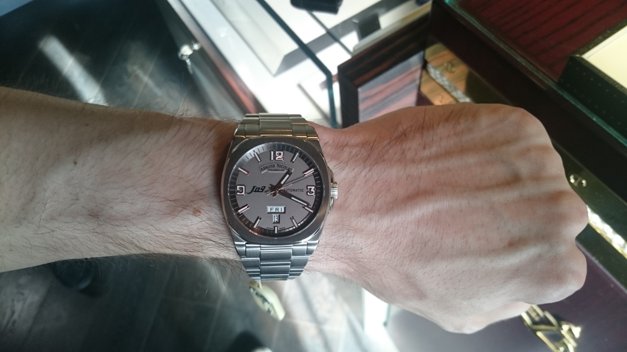Каково же было моё удивление, когда я увидел среди этих дорогих часов витрину Armand Nicolet. Собственно в живую часы меня приятно удивили и на моё запястье 17,5 вроде бы хорошо поместились :) Вложение 1489981 Вложение 1489982 Вложение 1489983 Вложение 1489984 Единственный нюанс - не совсем понял что за модели, т.к. на сайте цвет синих и коричневых часов совсем иной. И более того, у коричневых часов метки синего цвета, тогда как у тех, которых я мерил метки серебристые вроде :confused: Вложение 1489986 Вложение 1489987 |