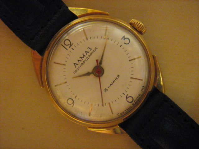 Вот такой Алмаз приобрелВложение 25757, такие в основном бывают в хромированном корпусе, а эти почему-то в позолоченном, на задней крышке выгравированно "Васильеву в день 60-ти летия, от коллектива Час. завода" и больше ни чего ни "Противоударные" ни "Пылезацищенные", возможно коллектив и поставил позолоченный корпус на свое усмотрение.