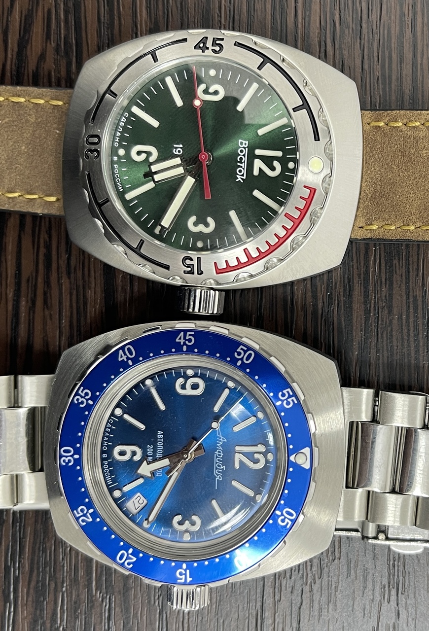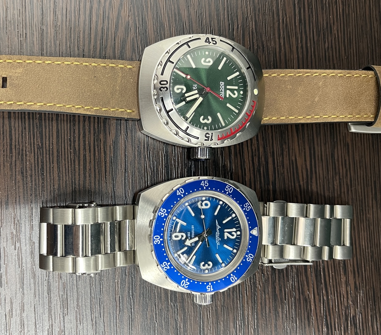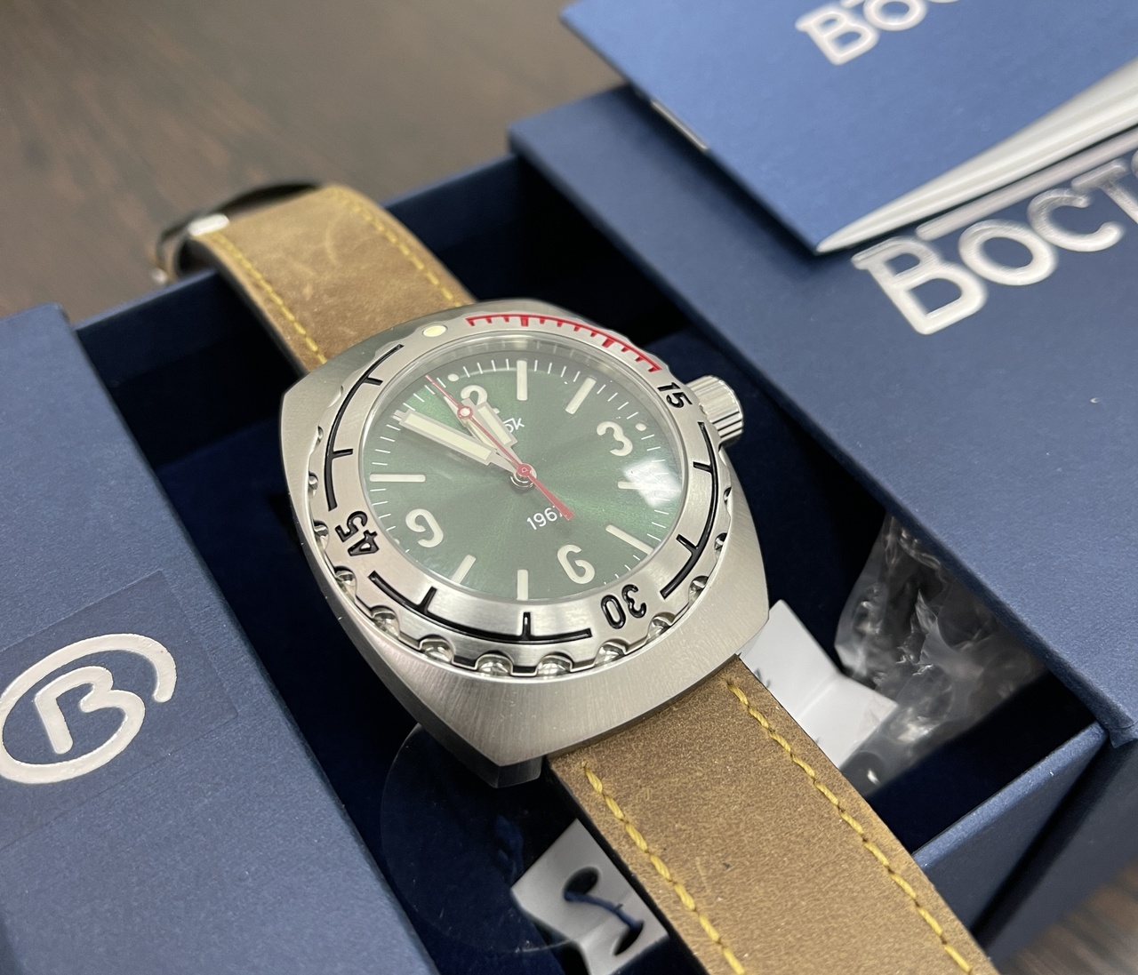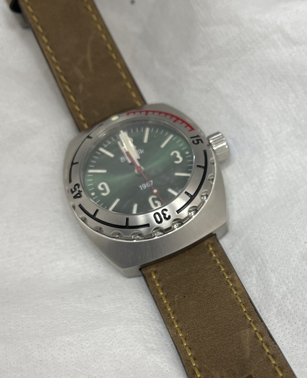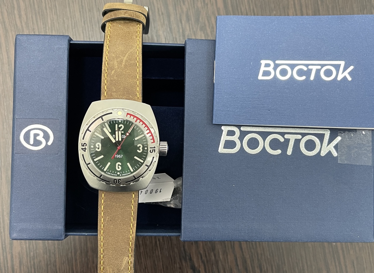 Приехали заказанные коллеге 190045. Мясистая штука, солидная. В то же время с обаянием скромности. Зеленый циферблат хорош.