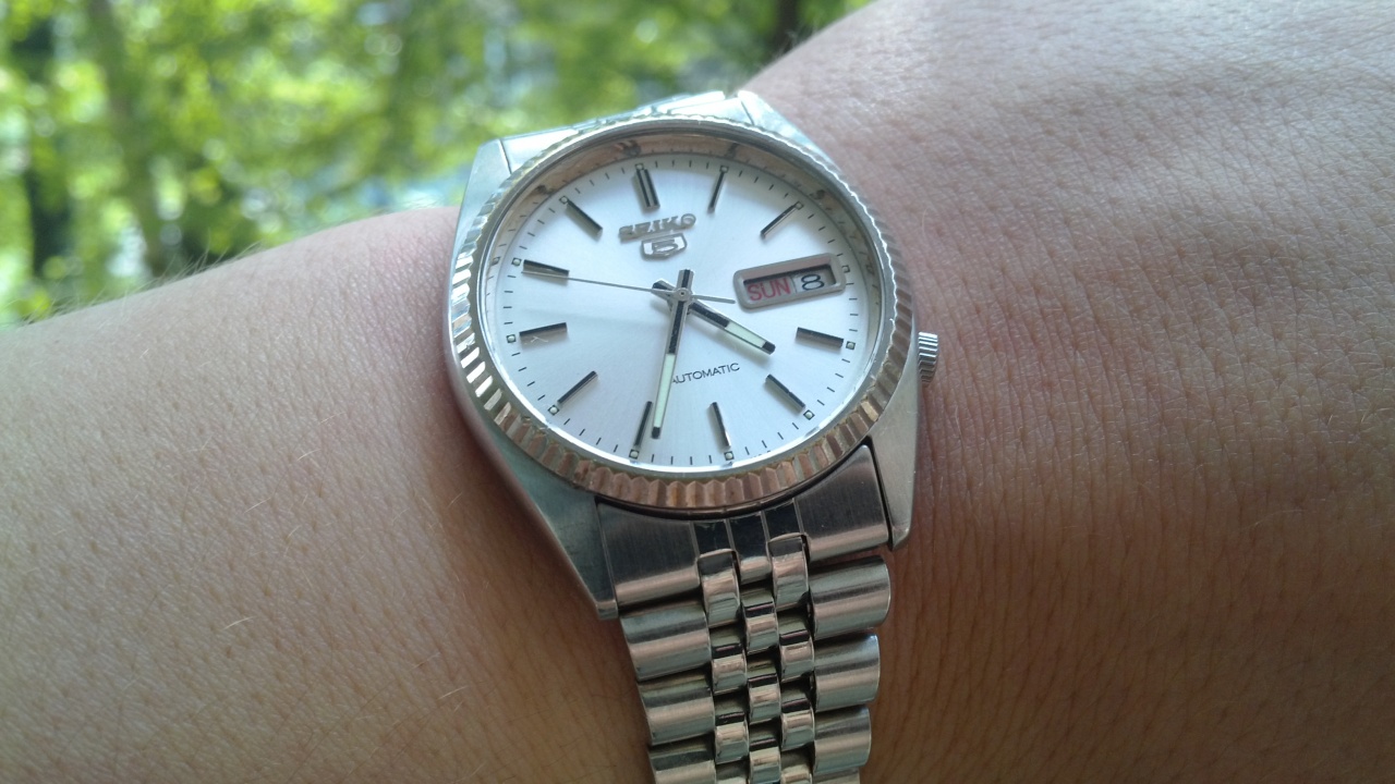 Добрый день.Приобрел сегодня вот такие Seiko 5.С годом выпуска 1997 или 2007 ? На стекле с внутренней стороны или на самом стекле в районе 6ти часов еле заметно нанесен логотип "Seiko 5".В теме про калькулятор даты Seiko задавали не раз вопрос что за логотип,но ответа я не нашел?Может кто что сказать про него?