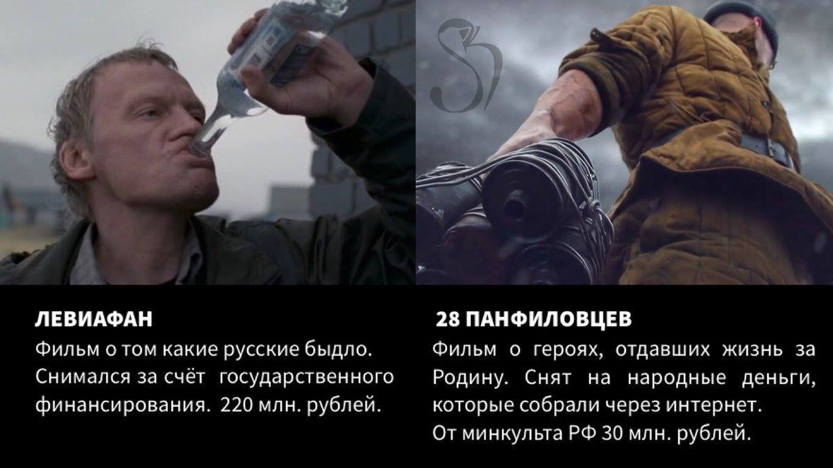 Левиафан - хороший фильм. И это тоже Россия. И это мы. И пенять на зеркало глупо, ИМХО. А 28 панфиловцев - это не про Россию. Это про Советский Союз. И не про нас, а про тех, кто жил и умирал 70 лет назад. Совсем про других людей