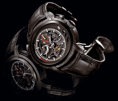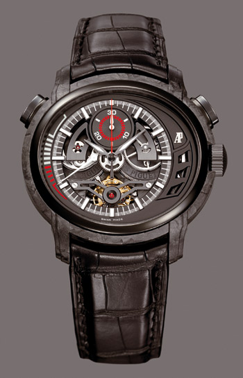Давно марка не производила этаких «мастодонтов» - прямо из недр научно-исследовательской лаборатории AUDEMARS PIGUET, ограниченные 120 экземплярами, Millenary Carbon One Tourbillon Chronograph. Главная особенность новой модели это использование при ее создании новых высокотехнологичных материалов – главным образом карбона. Так при создании корпуса, монолитного с дужками крепления ремешка, был использован материал, состоящий из 76% карбона и 24% полиамида и спрессованный под давлением 300 кг на квадратный сантиметр, его твердость составляет 626 по Vickers’у, а вес часов всего 69.44 грамма. Безель, заводная головка и кнопки хронографа выполнены из керамики, а задняя крышка из черненой стали. Корпус размером 47мм на 42 мм, водостойкость 20 метров.