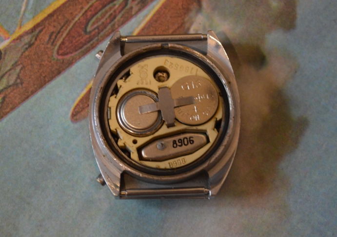 Что это за агрегат? Понятно что не Э1, но кто производитель и как обзывается? Крышка похоже нет от этих часов. Надписи как на механике. Пере6мычки между элементами не было, так на скорую руку из латунной фольги кусочек приложил, что то пытаются изобразить на индикаторе. Но как управлять, чтобы хотя бы попытаться выставить время, и понять работают или нет, не пойму. Кнопки всего две, мне такого ещё не попадалось. |