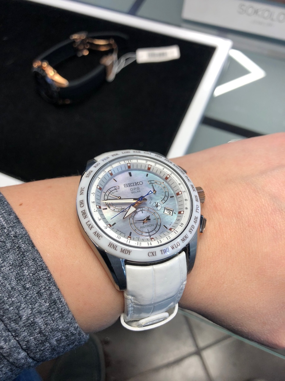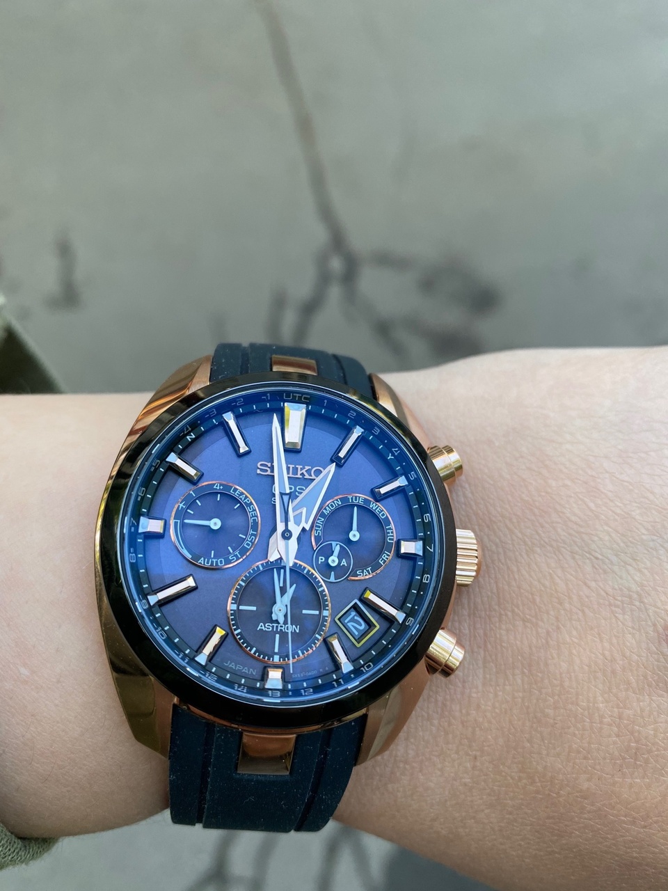 Astron вообще мои любимые часы. В первый раз их увидела на витрине магазина в Риге. Стояла там какая-то модель с синим циферблатом, просто космос. Стояла и смотрела, как они сверкают. Мне виделось в них что-то звездное. Жаль, не посмотрела номер модели. Сейчас в коллекции две модели. Обе лимитки. Обе невероятно красивые. Обе титан.