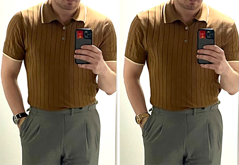 Выбор размера, как и манеры ношения - автор решил подчеркнуть собственные физические достоинства. Почему бы и нет, если они бесспорны. Вдобавок, с такими брюками незаправленное поло точно бы перечеркнуло старания и образ в целом обратился бы в нелепость. На мой взгляд, лук больше ориентирован в сторону офиса и того, что с ним связано, т.е. это довольно сдержанный смарт-кэжуал, но с элементами, если угодно, :)самоиронии:). |
