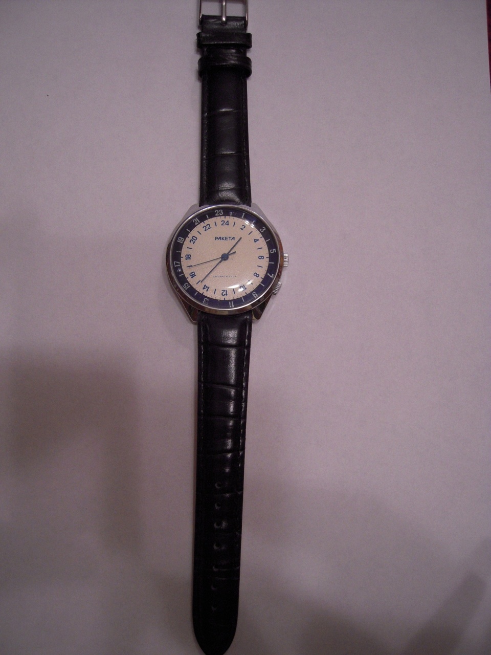 Принимайте в ряды ракетчиков! Стал обладателем двух замечательных 24-х часовых ракет. Надо сказать, что давно уже хотел данные часы, но постоянные командировки не позволяли осуществить задуманное. Обе купил на молотке. Первыми пришли синие-вахтенные, состояние хорошее, открыв крышечку и изучив механизм обнаружил не родной мост баланса (с фаской). Матчасть изучал уже после покупки. Изначально спешили на 2 минуты в сутки, но после регулировки точность хода составляет -7сек в сутки, запас хода 48ч 45м 17с. Долгожители в моей коллекции. Ремешок подобрал под цвет внешнего лимба, темно синего цвета (первое фото), присмотрел совершенно случайно. Вложение 352874 Вложение 352875 Вложение 352876 Вложение 352877 Вторыми пришли часы со вторым часовым поясом, с городами. Состояние на пять. точность хода +37сек в сутки, пока не регулировал. Запас хода составил 46ч 20м ровно. Вложение 352879 Вложение 352880 Вложение 352881 Вложение 352882 Часами очень доволен. Еще хочу рассказать о забавном казусе. Получил я на почте первую посылочку, пришел домой, развернул, осмотрел, завел, идут, восторг, довлен... (думаю, для собравшихся здесь ощущуения смыла описывать нет). Время начало седьмого, на руке Seiko пятерочка, поставил ракету на шесть с копейками. Раз посмотрел, второй, третий ... Что-то не так, а что понять не могу. И только потом сообразил, что часовую стрелку надо перевести на 18 часов (т.е. там где у обычных часов 9). Аналогичный казус произошел и со вторыми часиками, только там я уже быстрее сообразил, что к чему. А вот проблем со считыванием информации нет. Главное привыкнуть, что минутная стрелка обыкновенная, а часовую надо смотреть на метки на цифере. |