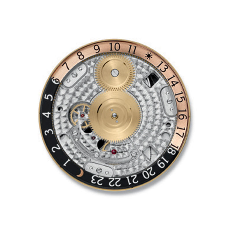 Модель оснащена механизмом с ручным заводом GPFAY08, размером 38,0 мм х 32,60 мм, на 38 камнях, с балансовой частотой 21,600 полуколебаний в час (3 гц) и запасом хода 96 часов. Функции: турбийон, индикация часов, минут, секунд (на турбийоне) и механизм игрового автомата с перезвоном. Источник |
