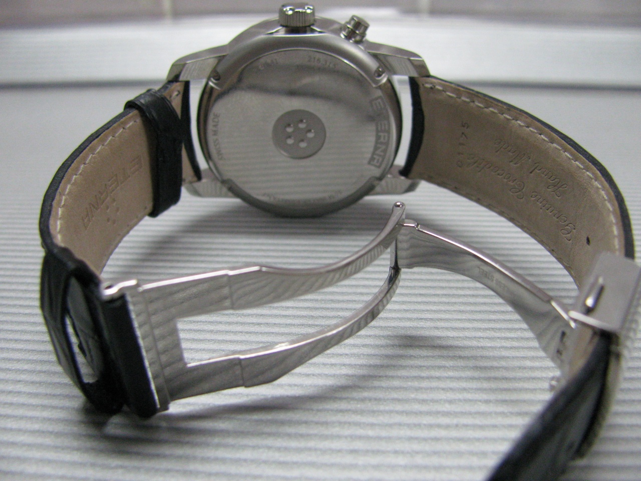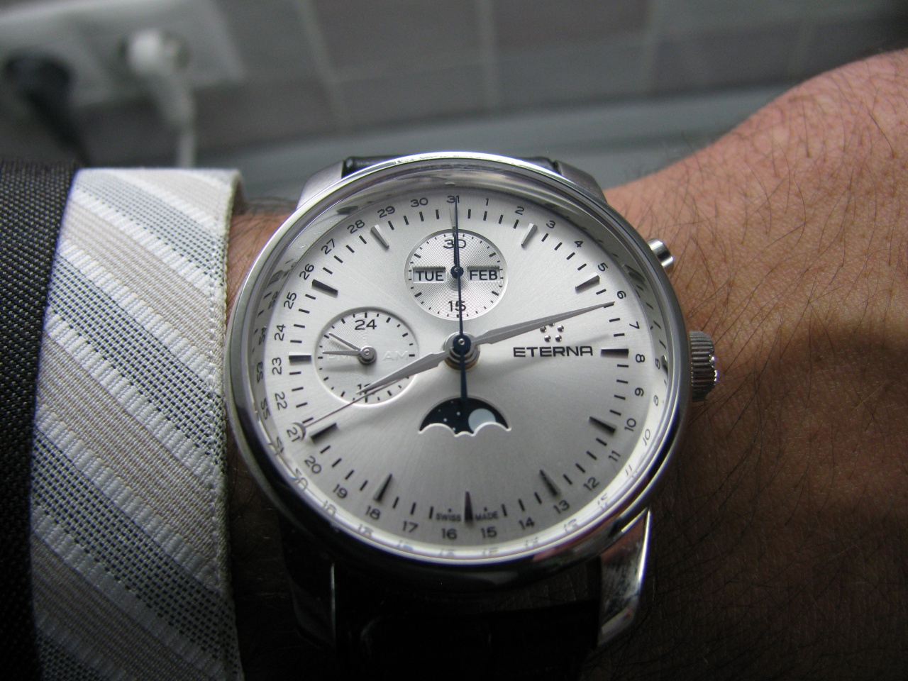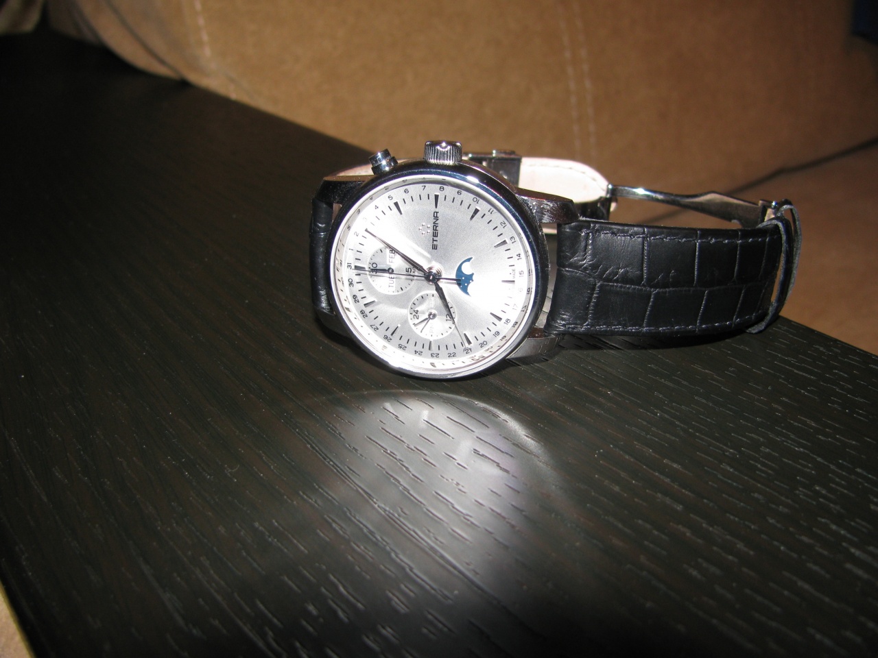 Очень хотел стать обладателем часов из серии Longines Master Collection Retrograde, но видно пока не судьба. Совершенно неожиданно неделю назад,я стал обладателем часов Eterna Soleure Chronograph Moonphase. Неожиданность обусловлена интересным ценовым предложением на форуме, желание иметь часы с лунником ну и разбавить свой парк кварца достойной механикой. Что могу сказать:часы великолепны, хотя и брал без примерки, ориентируюсь по фото и диаметру часов. Жаль конечно, что задняя крышка выполнена не из стекла. Ещё родной ремешок маловат. В целом же очень положительные эмоции вызывает. У многих производителей есть аналогичные модели, но по моему вкусу, здесь не перегружен циферблат. Очень строго и со вкусом. В большей степени конечно, подойдут под костюм, но как по мне, модель универсальна, и подойдет в том числе к джинсам и свитеру . Бегут вперёд на 7-8 сек в сутки. Вопрос к знатокам:стоит ли нести в мастерскую, для калибровки точности хода? |