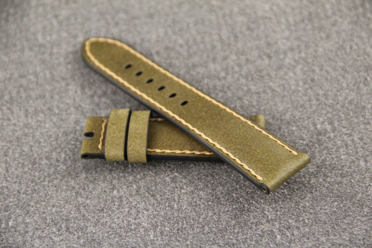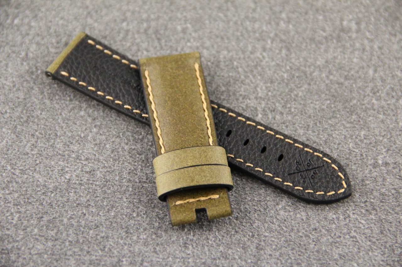 Ремешок для часов Tudor Heritage Black Bay Bronze. Верх ремешка сделан из "ammo" кожи подсумка ЮНА. Подкладка ремешка из кожи теленка. Кожа произведена на заводе Curtiba Ind- Тоскана, Италия. Ремешок прошит вручную.