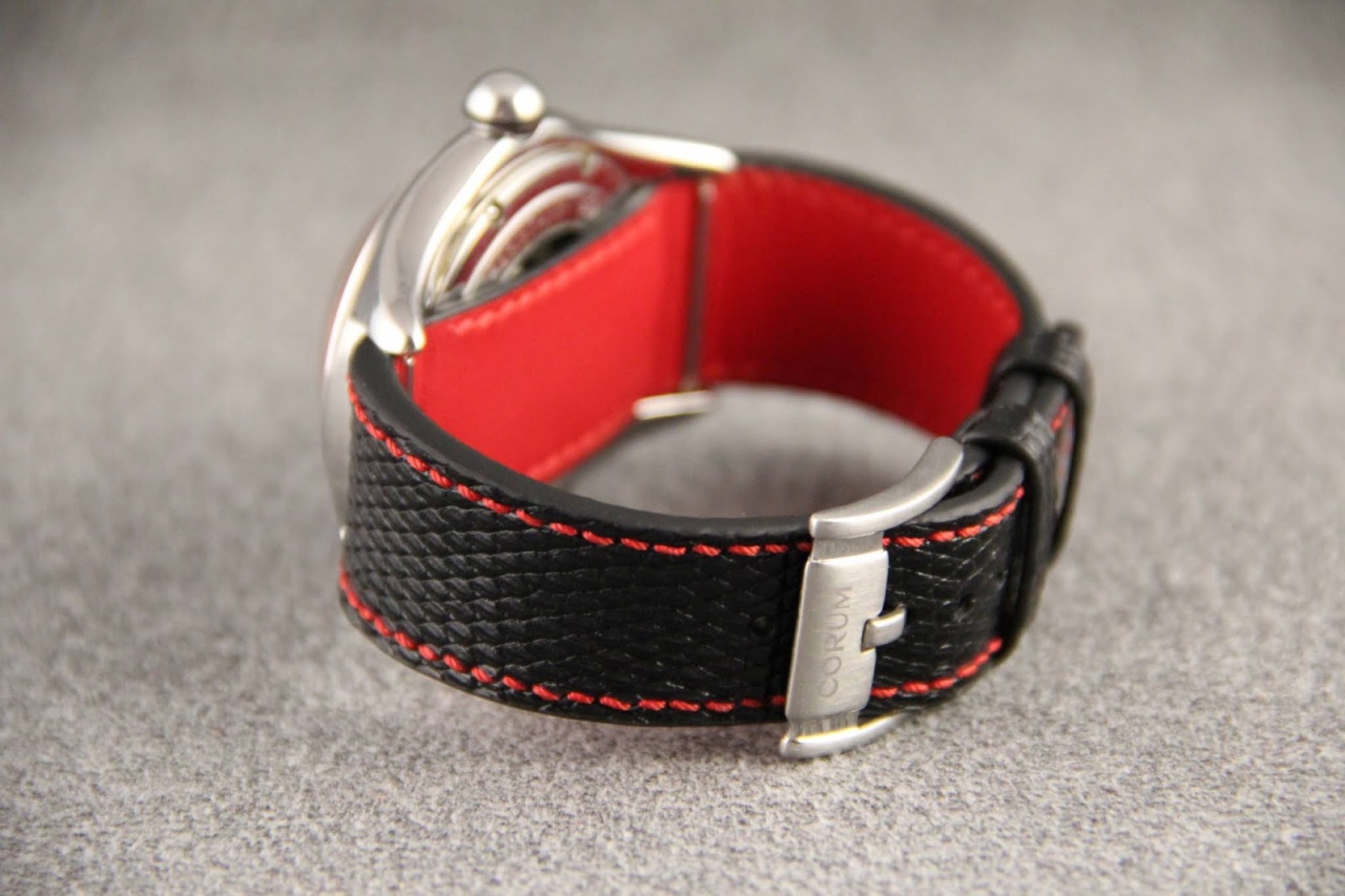 Ремешок для часов Corum Bubble Night Flyer Skull. Верх ремешка сделан из кожи теленка. Подкладка ремешка из кожи теленка. Ремешок прошит вручную.