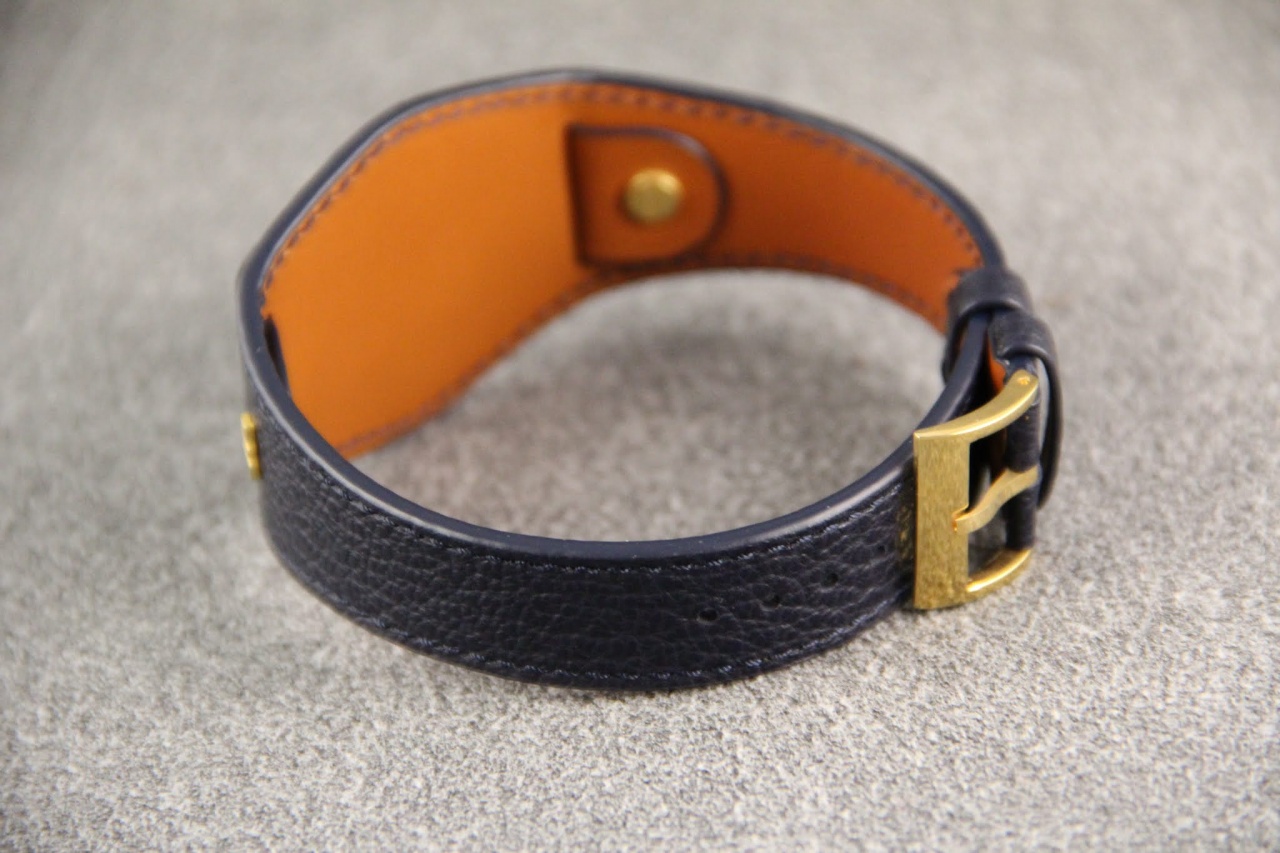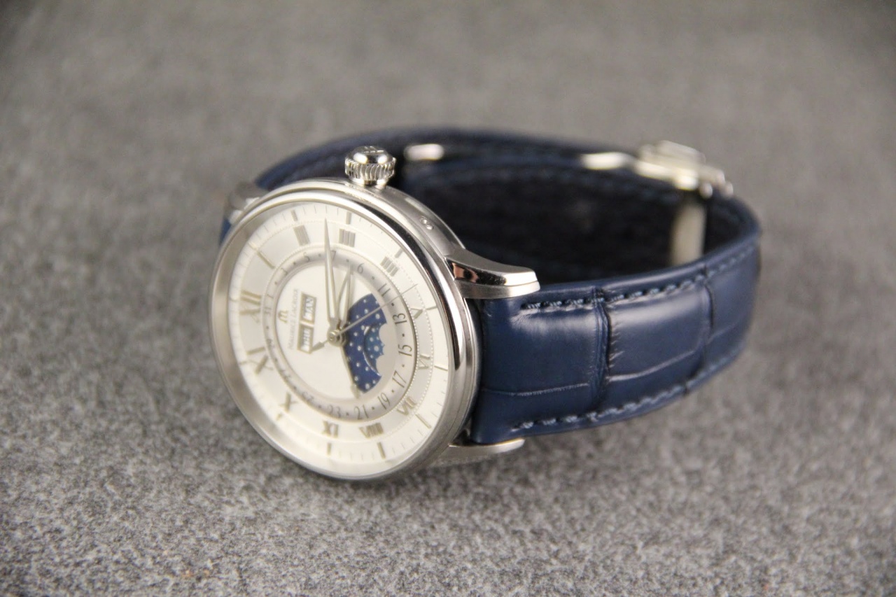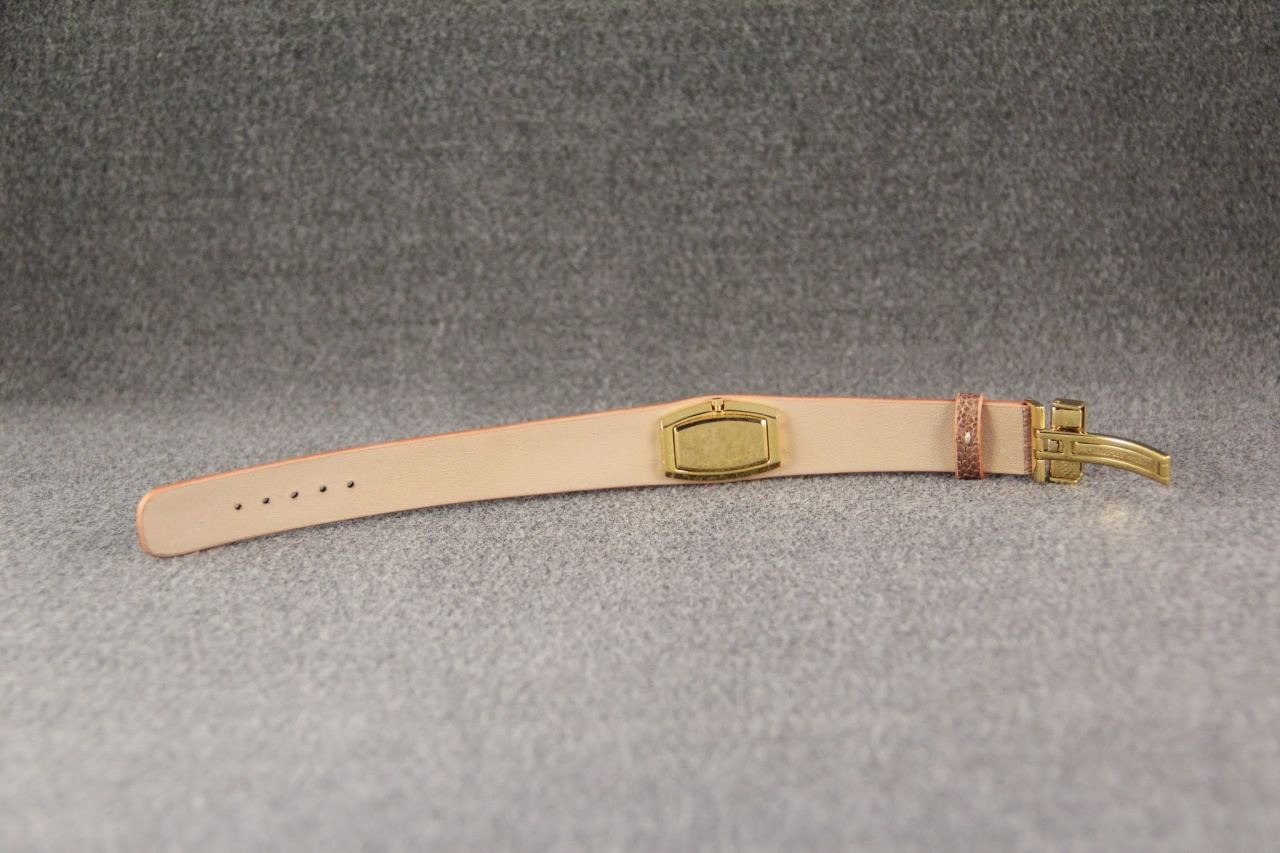 Моно ремешок для винтажных часов Maurice Lacroix. Верх ремешка сделан из кожи козы. Подкладка ремешка из кожи теленка. Кожа произведена на заводе Haas во Франции. Ремешок прошит вручную. Изготовление декоративных винтов из серебра. Пряжка и винты покрыты 24 каратным золотом.