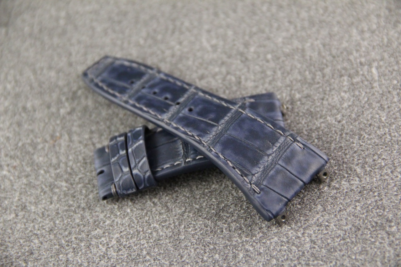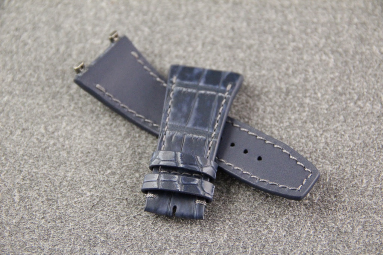 Ремешок для часов Bvlgari Assioma. Верх ремешка сделан из кожи аллигатора. Подкладка ремешка из кожи теленка Zermatt. Кожа произведена на заводе Haas во Франции. Ремешок прошит вручную.