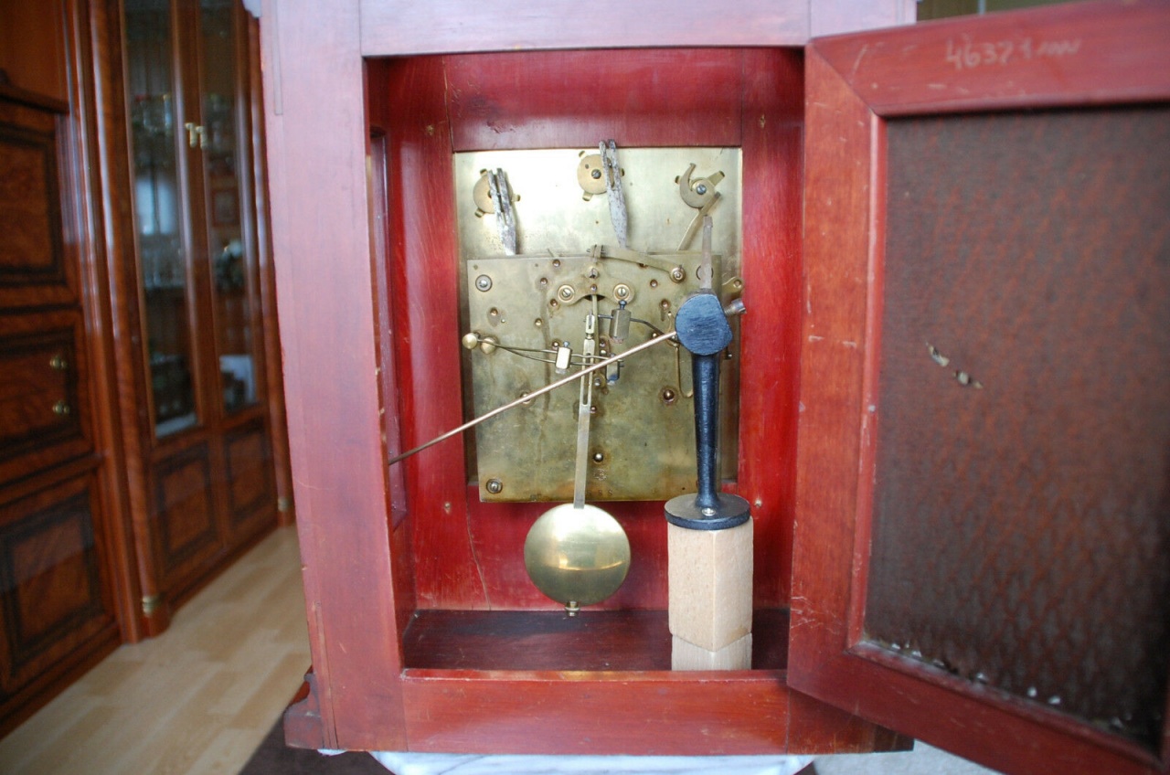 Вот такие интересные часики. Часы со свободным коротким маятником. Корпус, циферблат и стрелки похожи на ходики LFS на деревянных платинах. Но механизм металлический.