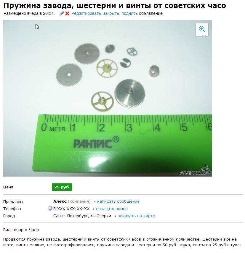 Вот так люди и богатеют - копейка к копейке, а не разбрасываются. С г***ом не расстанутся. И самое интересное, что находятся покупатели, а потом на нашем форуме выступают с вопросами, мол, вот купил классные часы чуть не за даром, только собрать... помогите.